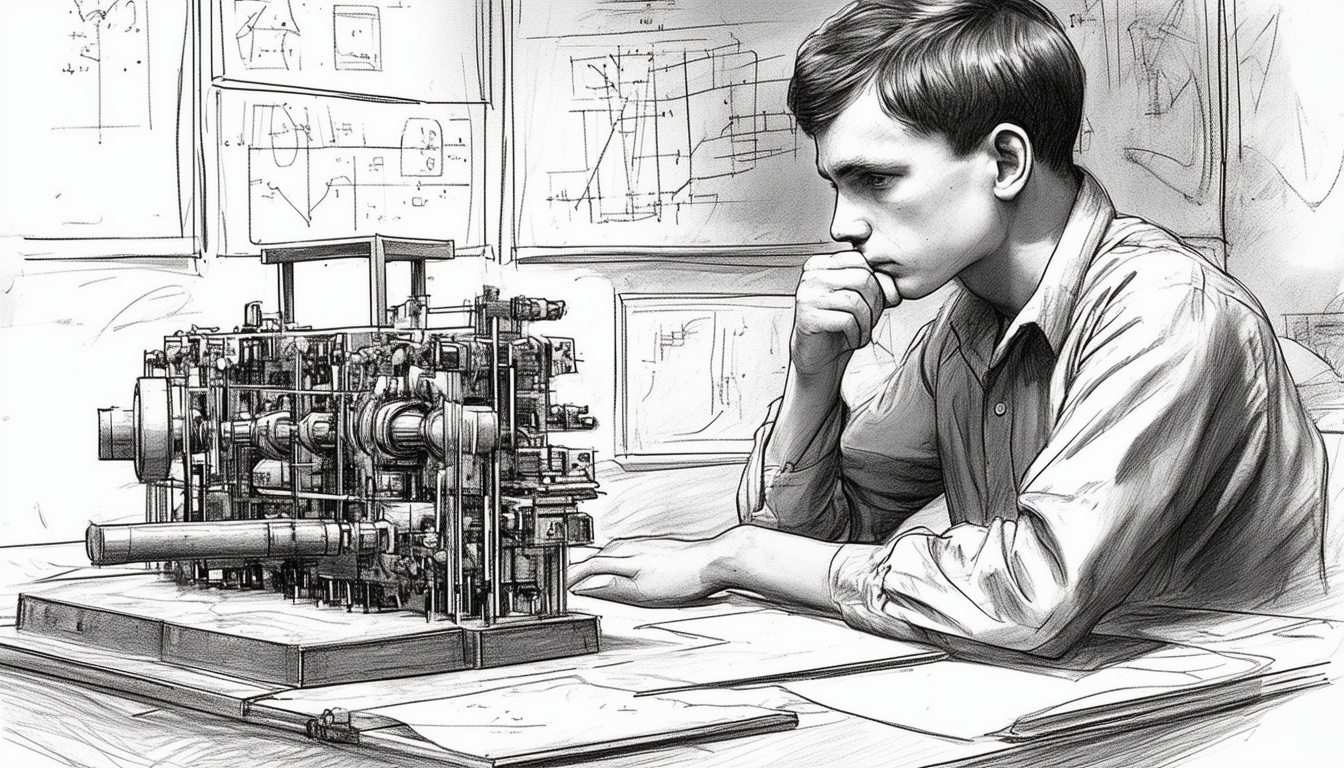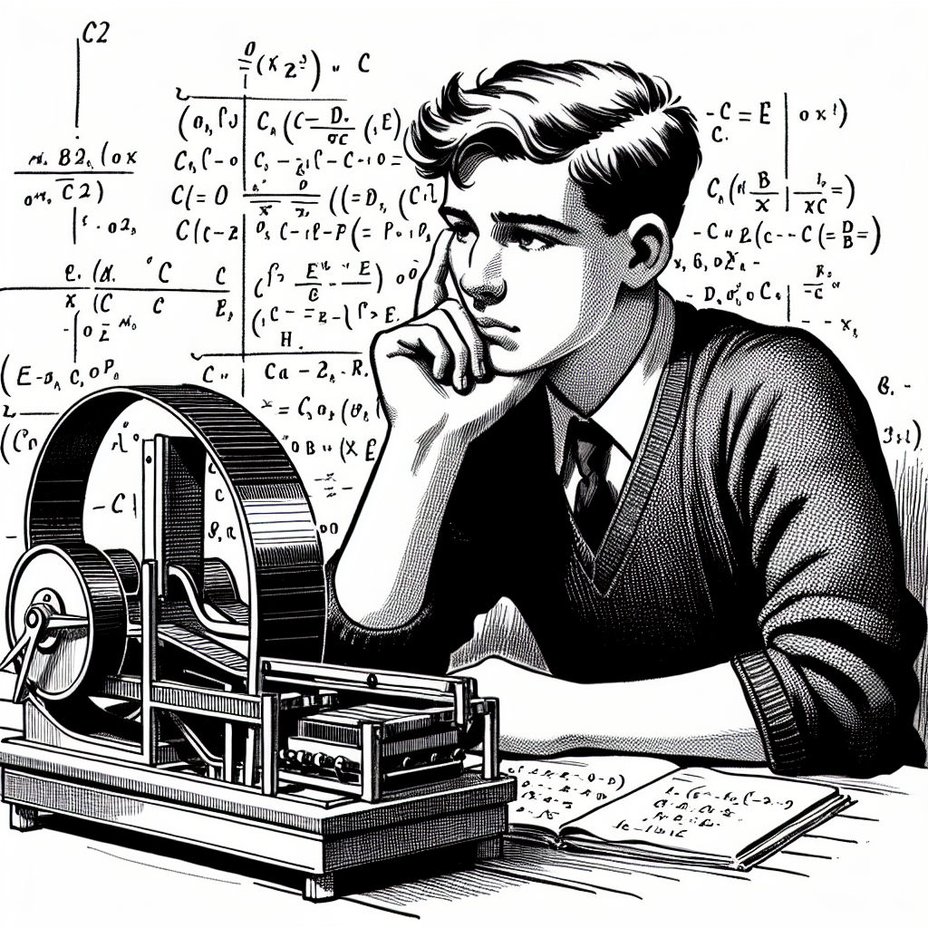 1 The black and white sketch depicts a young Alan Turing working attentively. He is sitting at a table with a model of the Turing machine in front of him, consisting of a long paper tape and a read/write head. Turing is holding his chin in one hand, with a focused and deep gaze, as if contemplating the mysteries of computation. The table and paper tape are covered with densely written mathematical symbols and formulas. The background is adorned with simple lines, highlighting Turing's focused expression and profound thoughts.