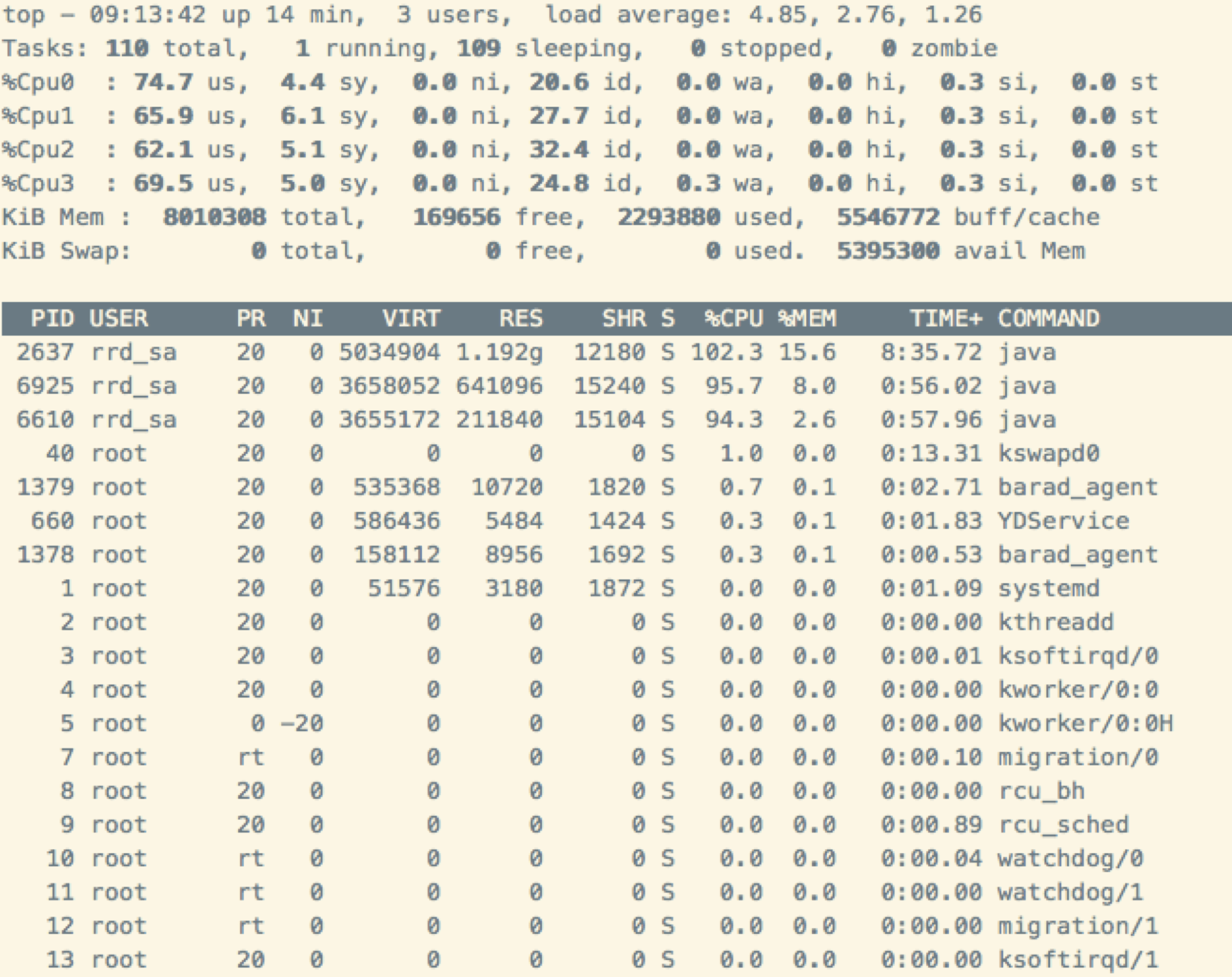 首先,我们来看一张图片。我在Kafka集群的某台Broker所在的主机上运行top命令,输出的内容如下图所示: