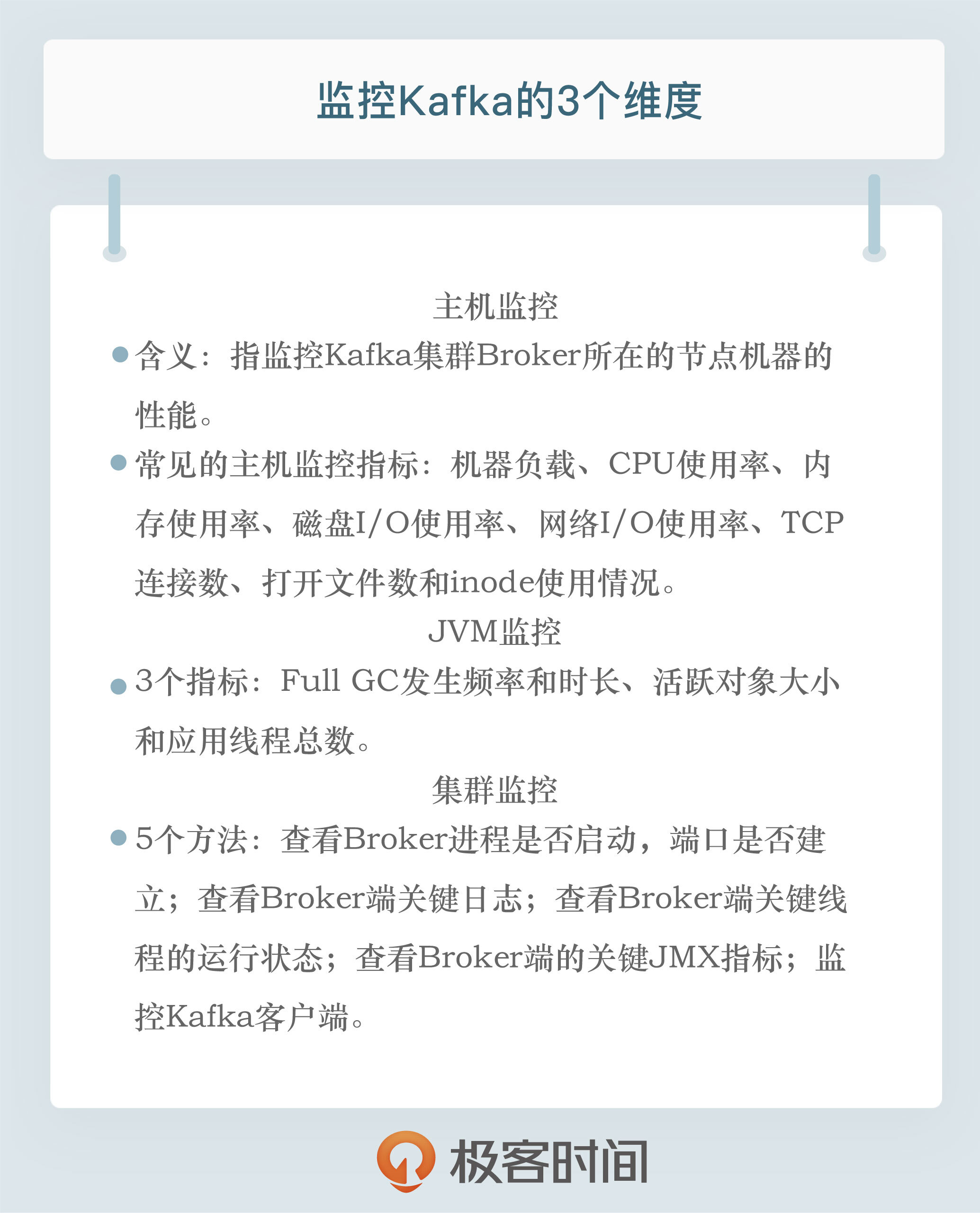 好了,我们来小结一下。今天,我介绍了监控Kafka的方方面面。除了监控Kafka集群,我还推荐你从主机和JVM的维度进行监控。对主机的监控,往往是我们定位和发现问题的第一步。JVM监控同样重要。要知道,很多Java进程碰到的性能问题是无法通过调整Kafka参数是解决的。最后,我罗列了一些比较重要的Kafka JMX指标。在下一讲中,我会专门介绍一下如何使用各种工具来查看这些JMX指标。