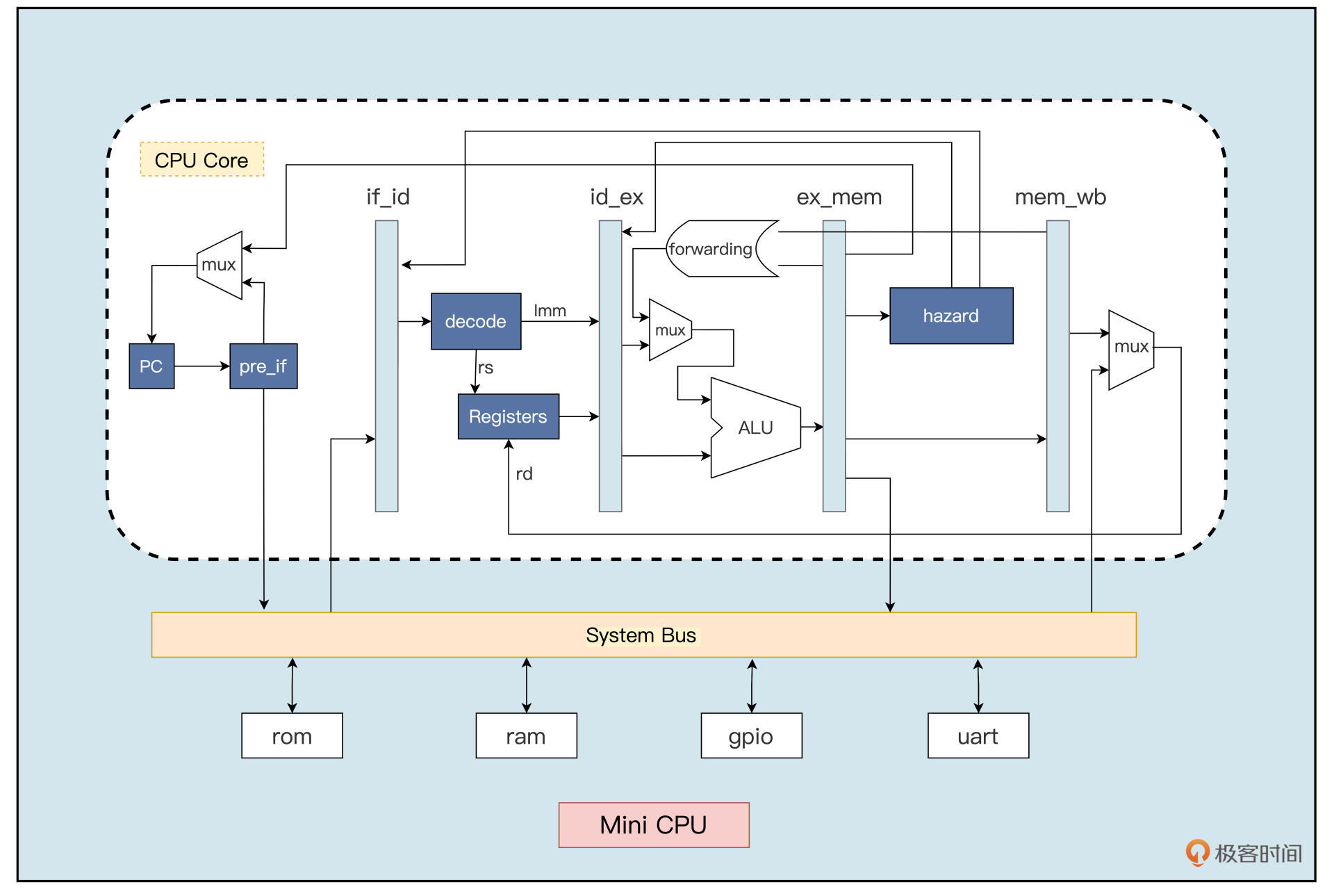 从MiniCPU的架构设计上也能看到,我们的重心放在了最能体现五级流水线的模块。不过麻雀虽小,五脏俱全,这个架构里已经包含了CPU内核,用于存放指令、数据的ROM和RAM以及一些简单的外设。CPU会通过系统总线(System Bus)和这些外设进行通信。