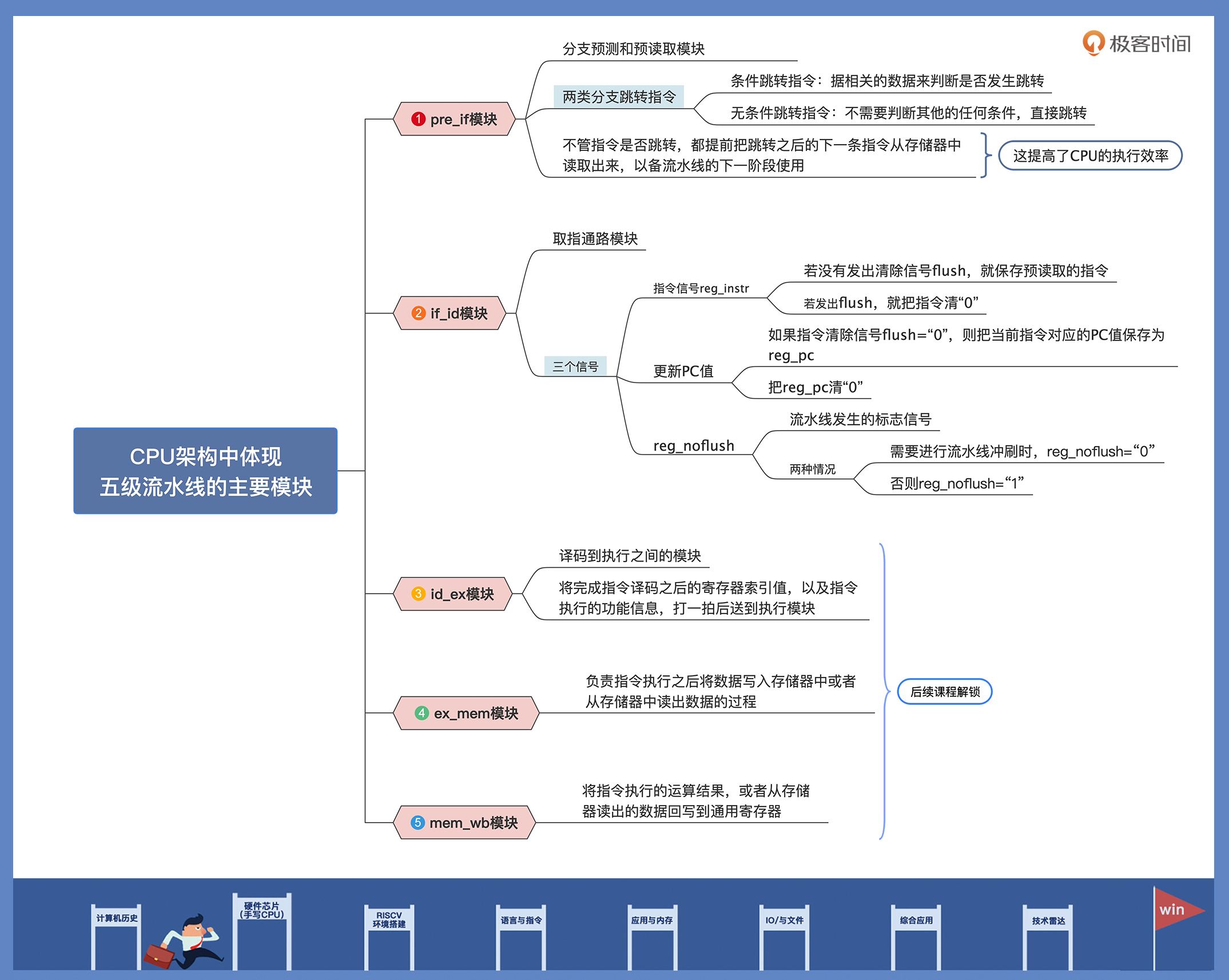 CPU架构里的五个主要模块,你可以参考后面的导图,其中前两个模块我们这节课已经拿下了,其它模块之后的课程里我们再展开学习。