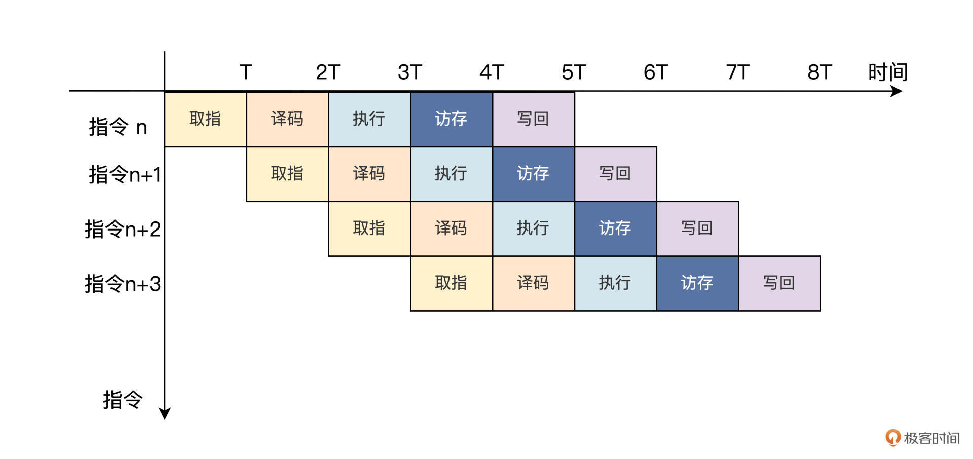 对照上图,CPU在第一个时钟周期T内完成取指操作。然后在第二个时钟周期2T内对上一条指令进行译码的同时,取下一条指令。接着在第三个时钟周期3T内就有取指、译码和执行3个操作同时进行……以此类推,五级流水线的CPU内就可以同时进行5个操作。这样平均下来,就相当于每条指令只需要五分之一的时钟周期时间来完成。