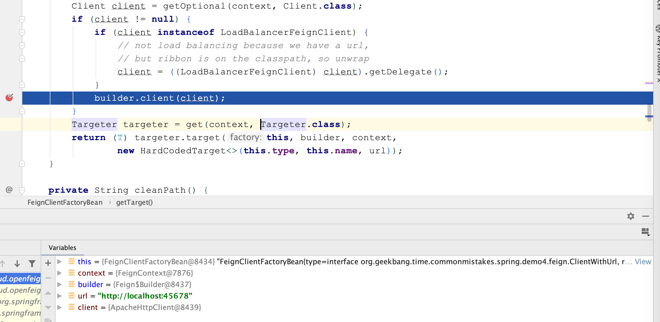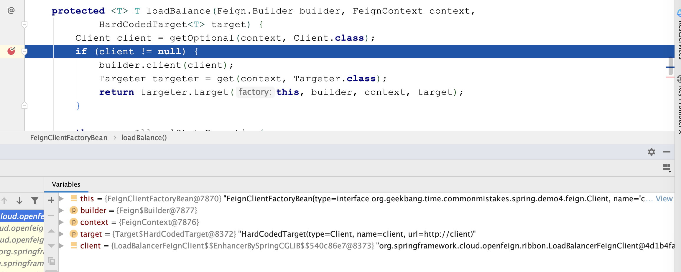 调试一下可以看到,client是LoadBalanceFeignClient,已经是经过代理增强的,明显是一个Bean: