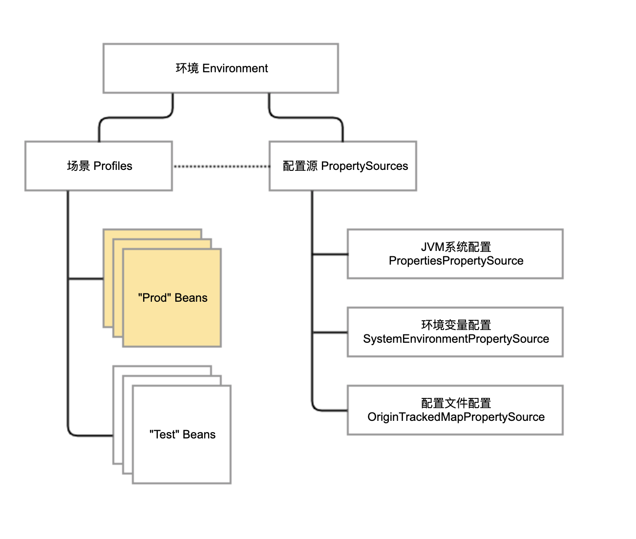 针对Property,又抽象出各种PropertySource类代表配置源。一个环境下可能有多个配置源,每个配置源中有诸多配置项。在查询配置信息时,需要按照配置源优先级进行查询。 Profile定义了场景的概念。通常,我们会定义类似dev、test、stage和prod等环境作为不同的Profile,用于按照场景对Bean进行逻辑归属。同时,Profile和配置文件也有关系,每个环境都有独立的配置文件,但我们只会激活某一个环境来生效特定环境的配置文件。