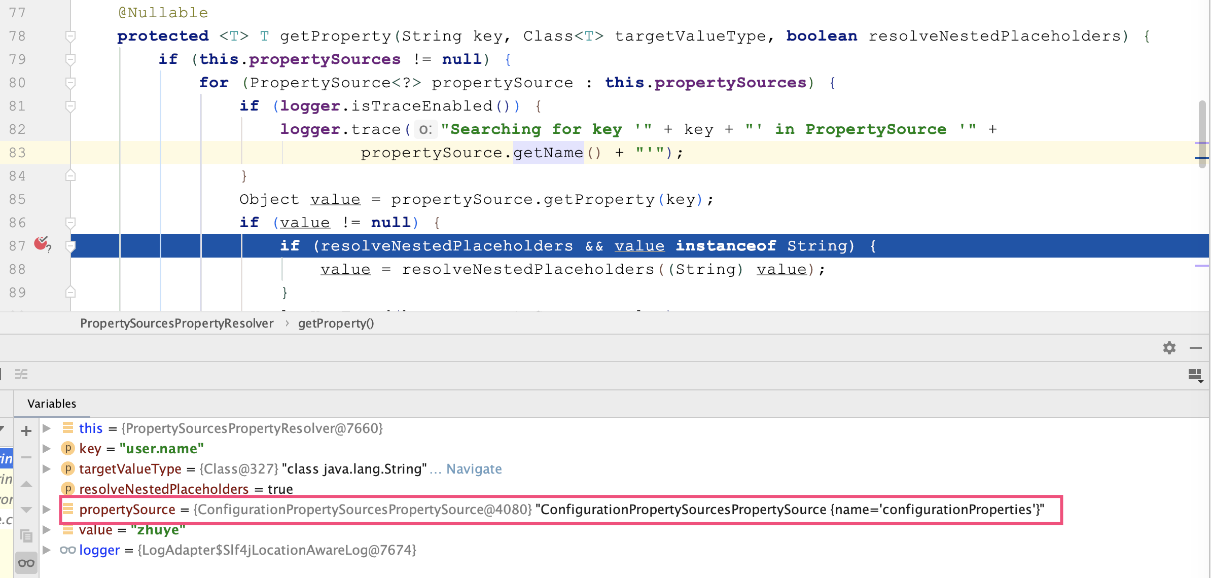 propertySourceList字段用来真正保存PropertySource的List,且这个List是一个CopyOnWriteArrayList。 类中定义了addFirst、addLast、addBefore、addAfter等方法,来精确控制PropertySource加入propertySourceList的顺序。这也说明了顺序的重要性。 继续看下PropertySourcesPropertyResolver(图中绿色类)的源码,找到真正查询配置的方法getProperty。