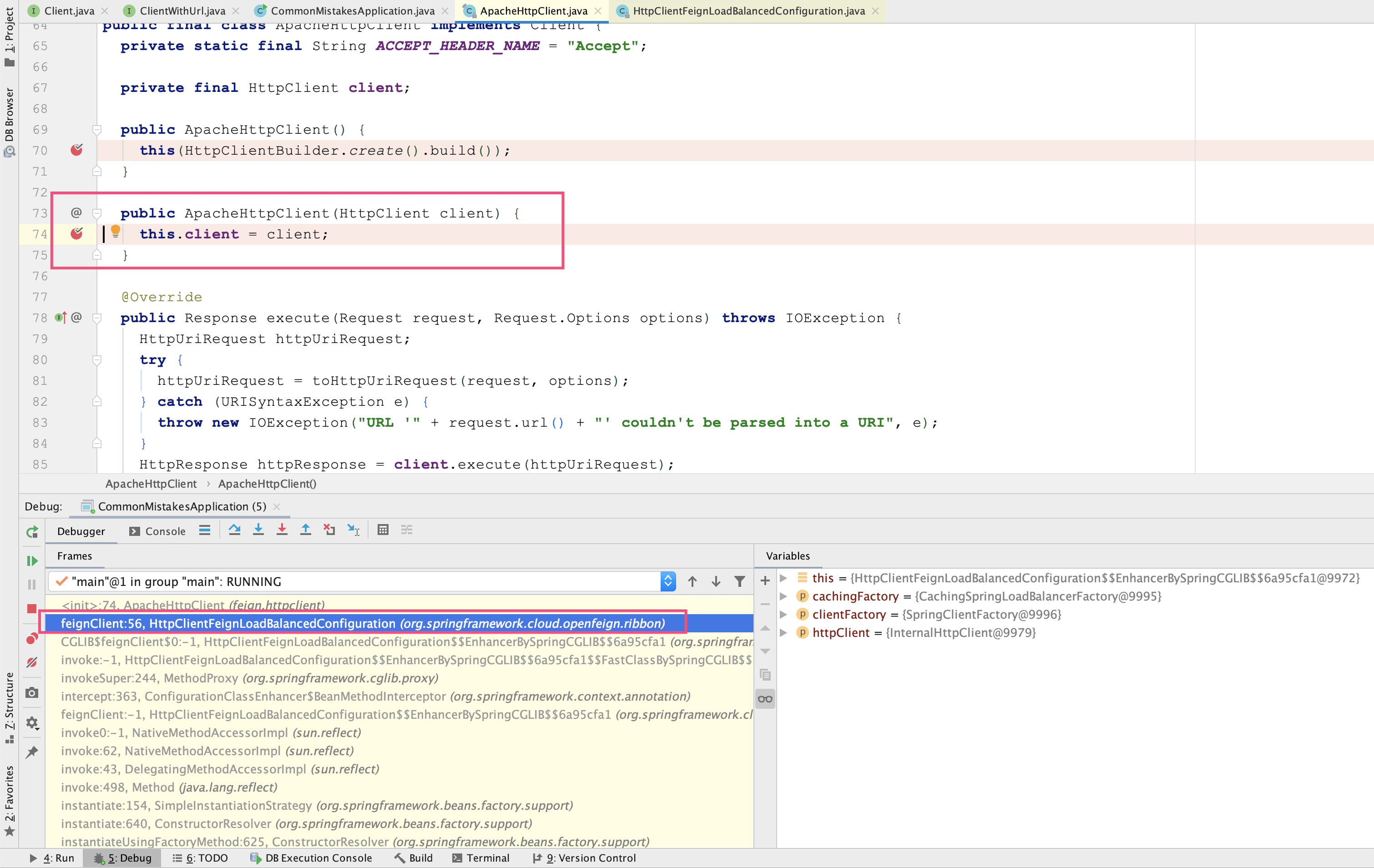 那么,这个ApacheHttpClient是从哪里来的呢?这里,我教你一个小技巧:如果你希望知道一个类是怎样调用栈初始化的,可以在构造方法中设置一个断点进行调试。这样,你就可以在IDE的栈窗口看到整个方法调用栈,然后点击每一个栈帧看到整个过程。