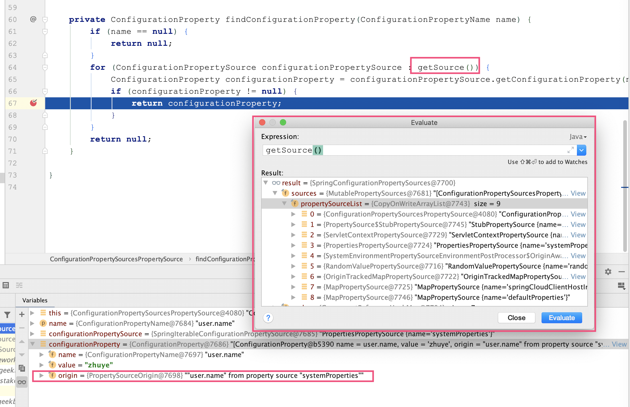 调试可以发现,这个循环遍历(getSource()的结果)的配置源,其实是SpringConfigurationPropertySources(图中黄色类),其中包含的配置源列表就是之前看到的9个配置源,而第一个就是ConfigurationPropertySourcesPropertySource。看到这里,我们的第一感觉是会不会产生死循环,它在遍历的时候怎么排除自己呢?