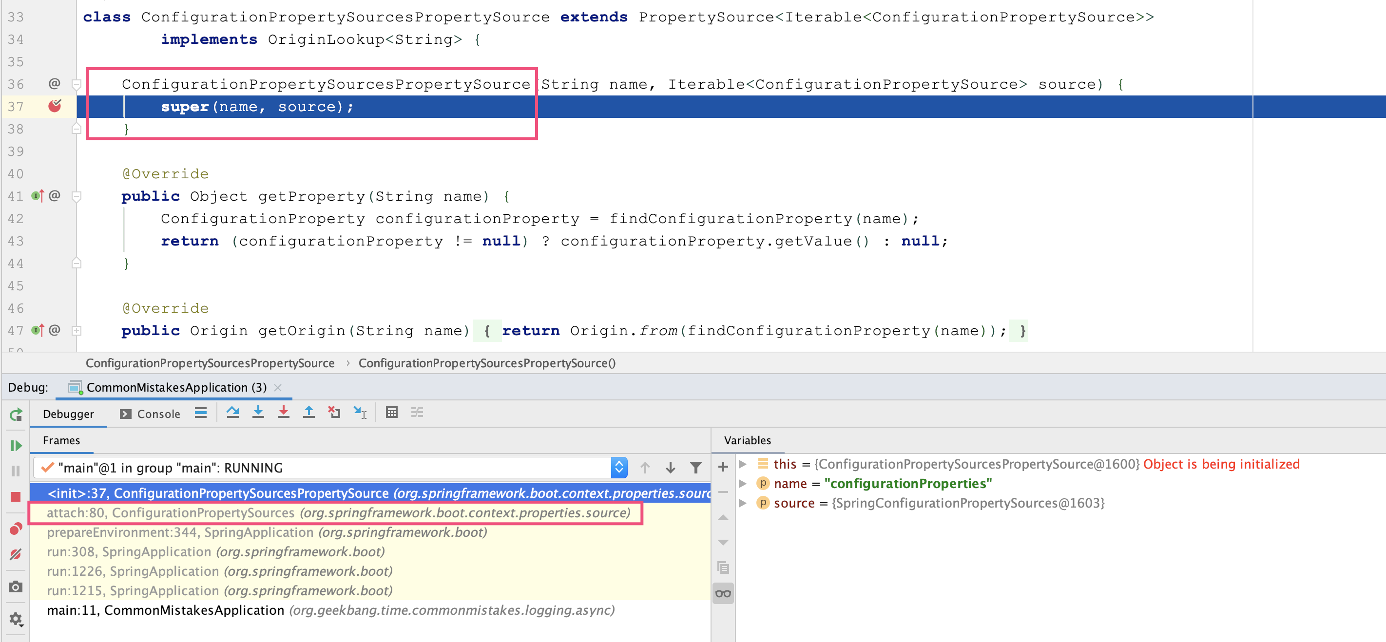 可以看到,ConfigurationPropertySourcesPropertySource类是由ConfigurationPropertySources的attach方法实例化的。查阅源码可以发现,这个方法的确从环境中获得了原始的MutablePropertySources,把自己加入成为一个元素: