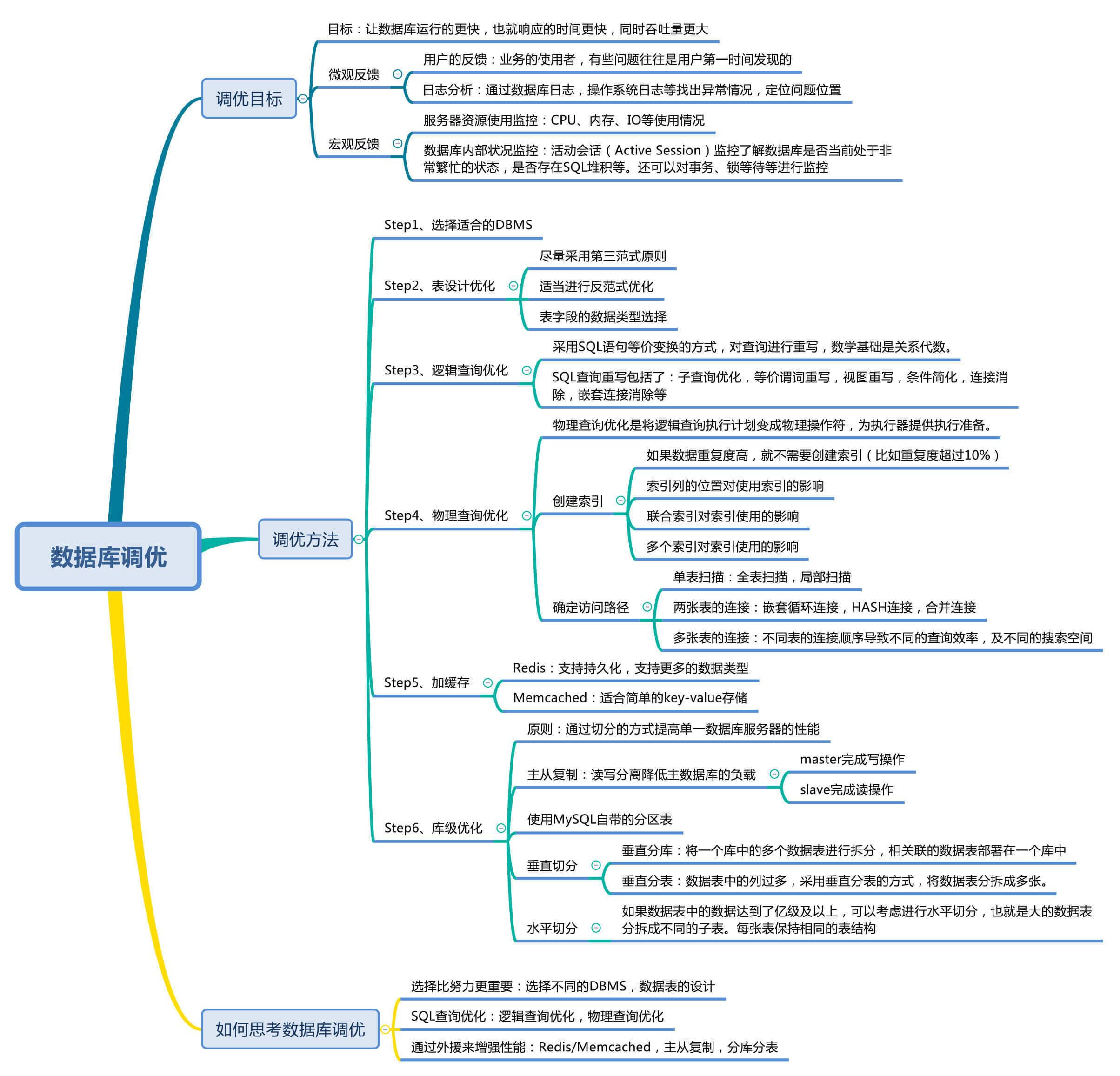 其实关于数据库调优的知识点非常分散。不同的DBMS,不同的公司,不同的职位,不同的项目遇到的问题都不尽相同。为了能让你对数据库调优有一个整体的概览,我把这些知识点做了一个梳理,希望能对你有一些帮助。
