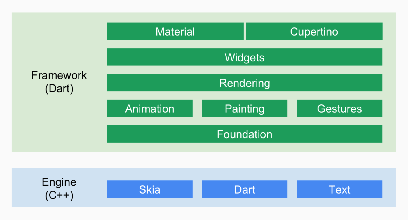 - 性能至上。内置布局和渲染引擎,使用Skia通过GPU做光栅化。选择Dart语言作为开发语言,在发布正式版本时使用AOT编译,不再需要通过解析器解释执行或者JIT。并且支持Tree Shaking无用代码删除,减少发布包的体积。