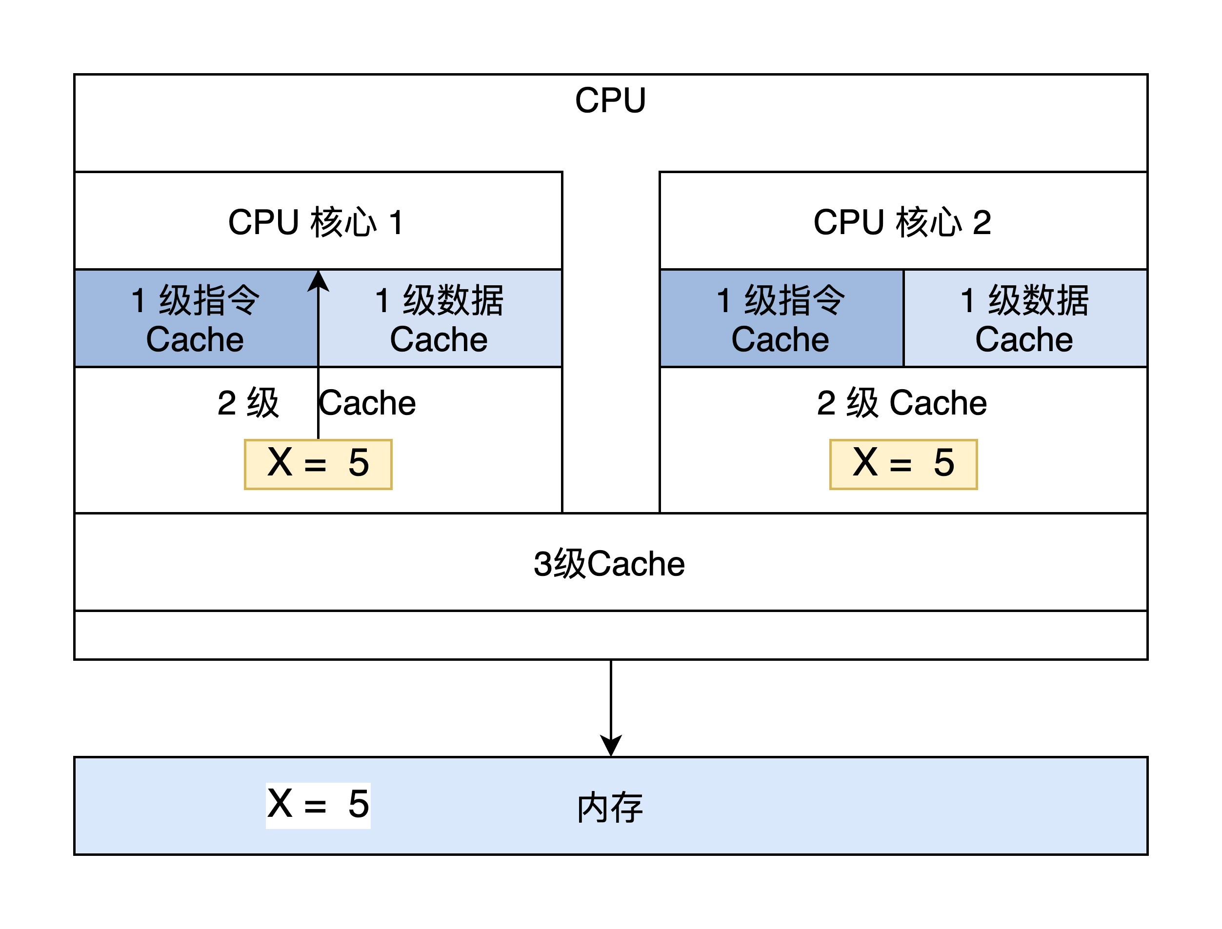 - S共享(Shared):当前Cache中的内容有效,Cache中的数据与内存中的数据一致,数据在多个CPU核心中的Cache里面存在。例如在CPU核心1、CPU核心2里面Cache中的X=5,而内存中也是X=5保持一致。