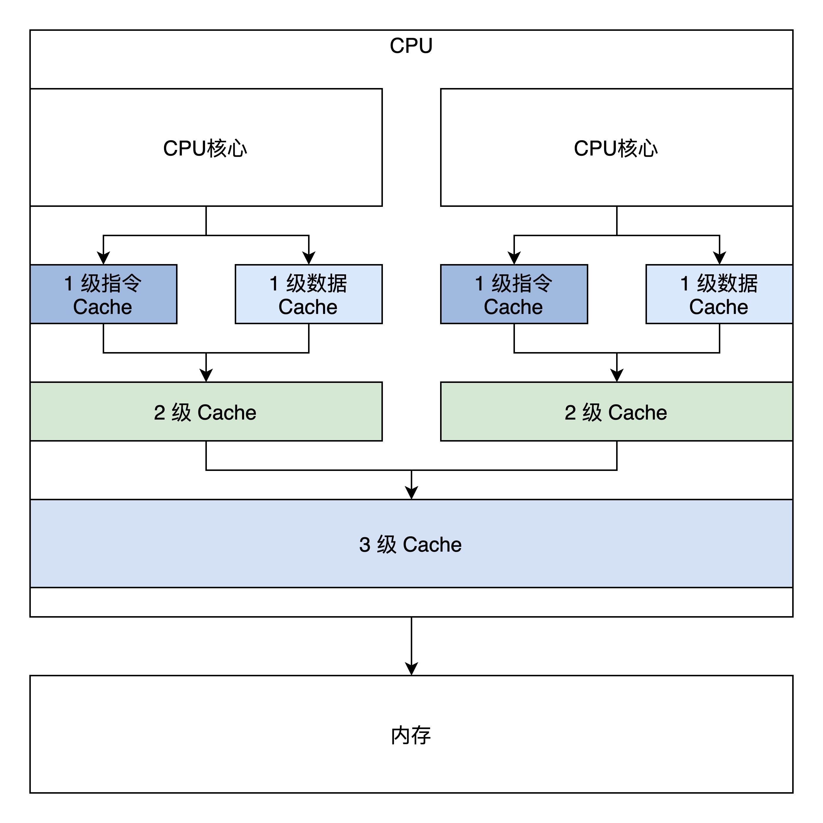 为了搞清楚这个问题,我们必须先搞清楚Cache在硬件层面的结构,下面我画了x86 CPU的Cache结构图: