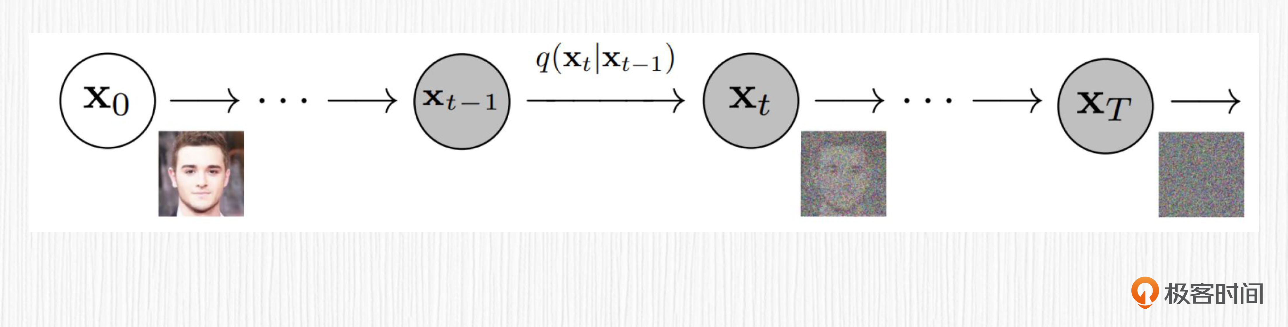 你可能已经注意到了,每一步的加噪结果仅依赖于上一步的加噪结果和一个加噪过程,而这个加噪过程依赖于当前时间步t,因此整个加噪过程可以看成参数化的马尔科夫链。
