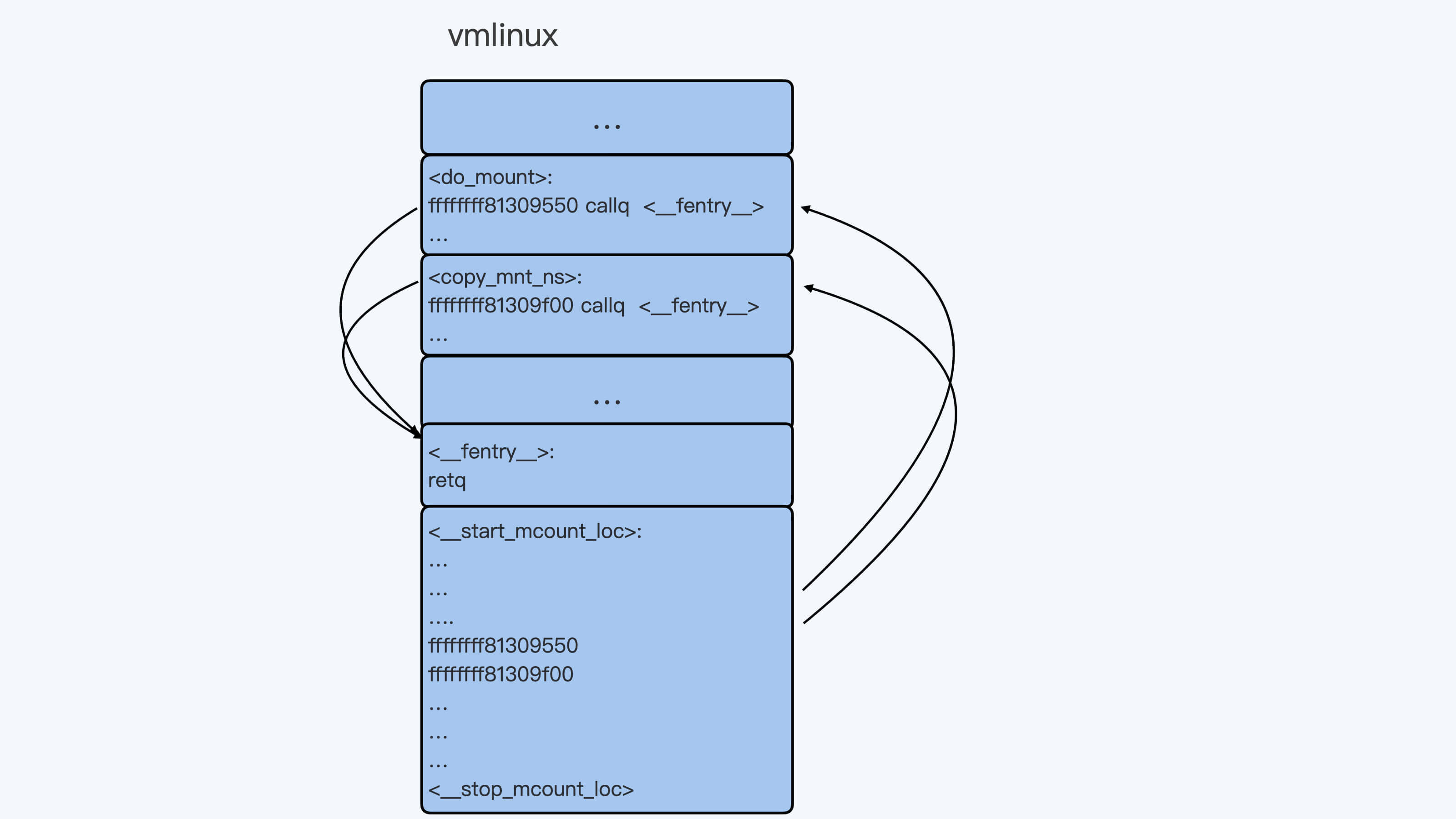 而”-mrecord-mcount”参数在最后的内核二进制文件vmlinux中附加了一个mcount_loc的段,这个段里记录了所有”callq <fentry>”指令的地址。这样我们很容易就能找到每个函数的这个入口点。
