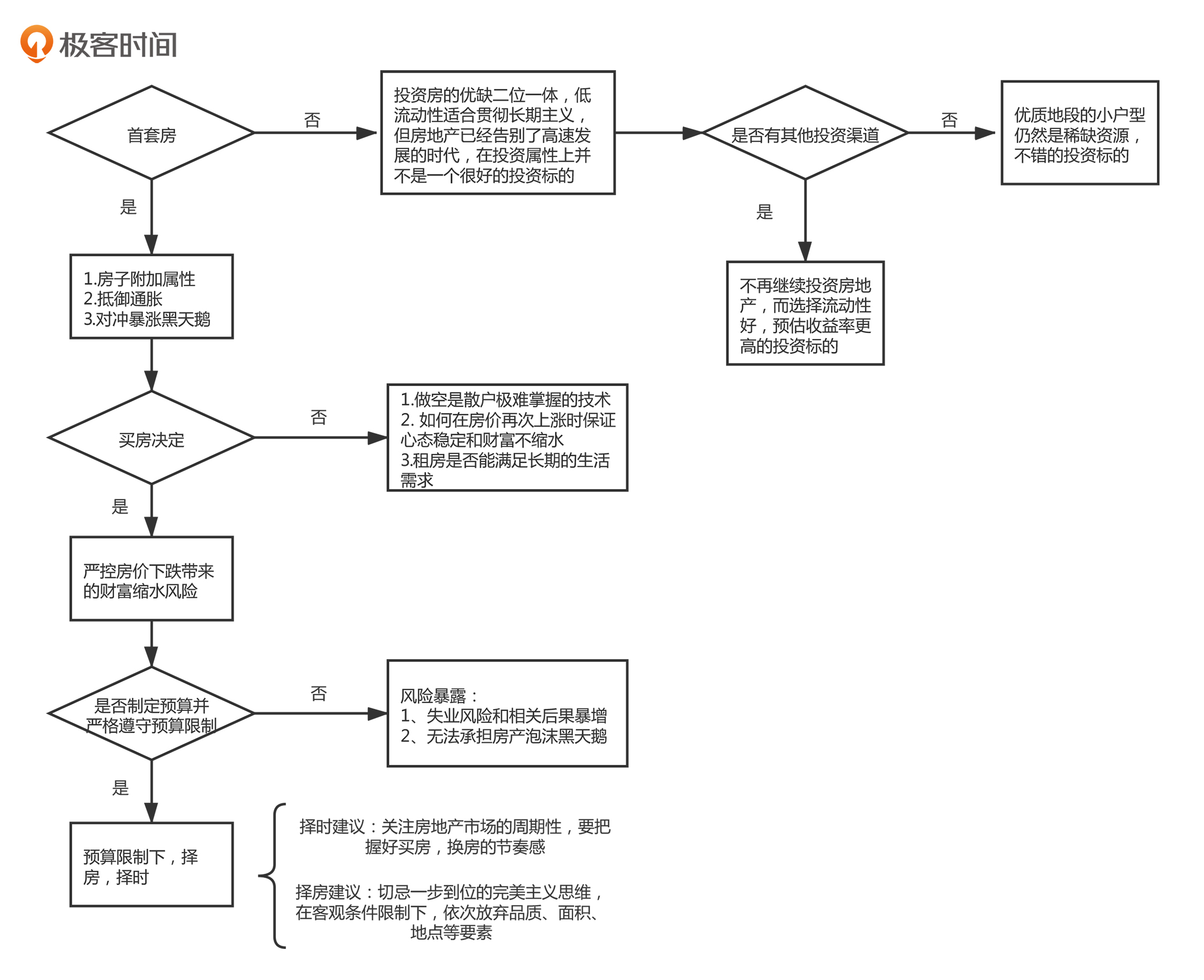 在这一讲中,我们可以说是从整体逻辑上理清了买房的决策链条。下面,我用程序流程图的形式,梳理了这一讲我们讲到的买房逻辑,供你参考。