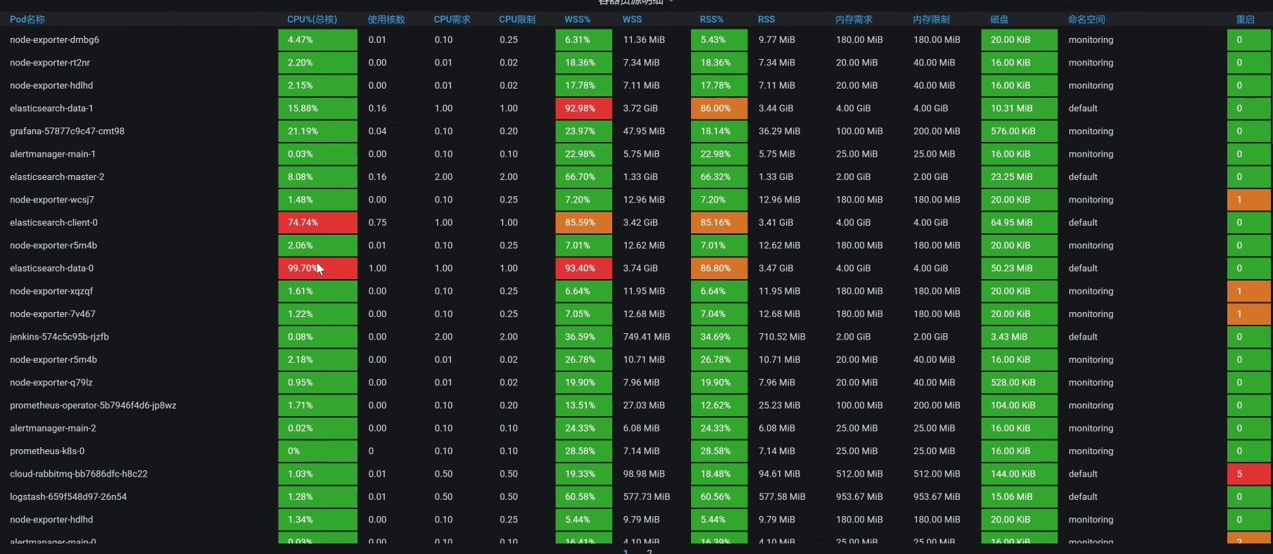 嗯,不错,ES data的POD把资源用起来了。其实这里要想继续调,还可以把CPU加大,ES本来就是吃CPU、内存的大户。不过,我们前面在配置的时候,给ES data的CPU也确实太小了。这个问题,并不是我故意设计出来的,而是当时在部署的时候,没考虑到这些。