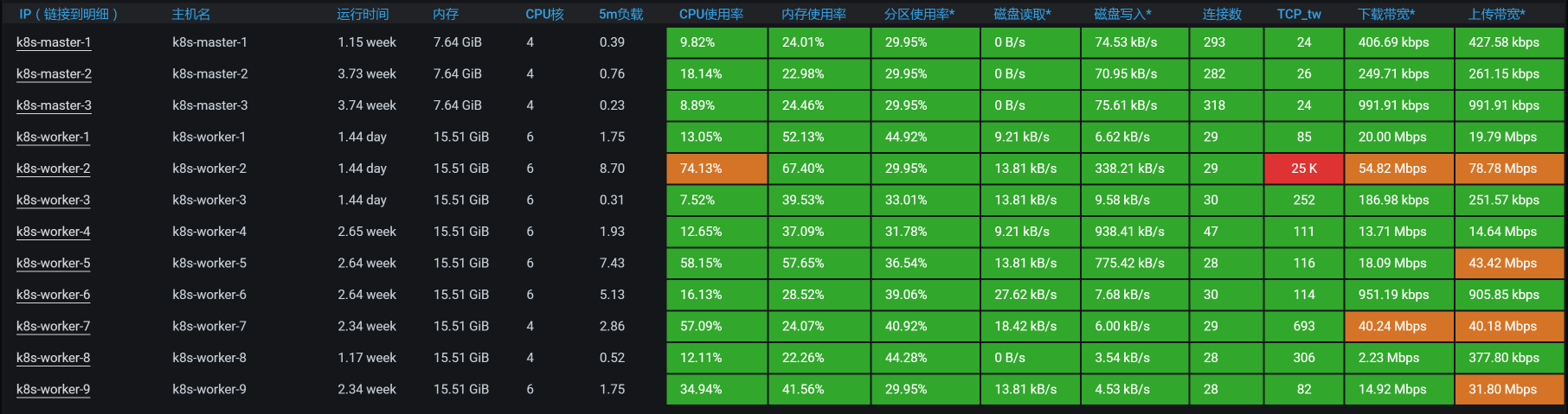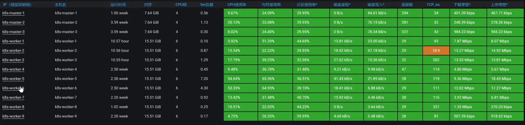 回到我们这个例子中,从下面的k8s worker(也就是k8s中的node,在我们的环境中我习惯叫成worker,就是为了体现:在我的地盘,我爱叫啥就叫啥)的数据上来看,似乎没有一个worker的资源使用率是特别高的。