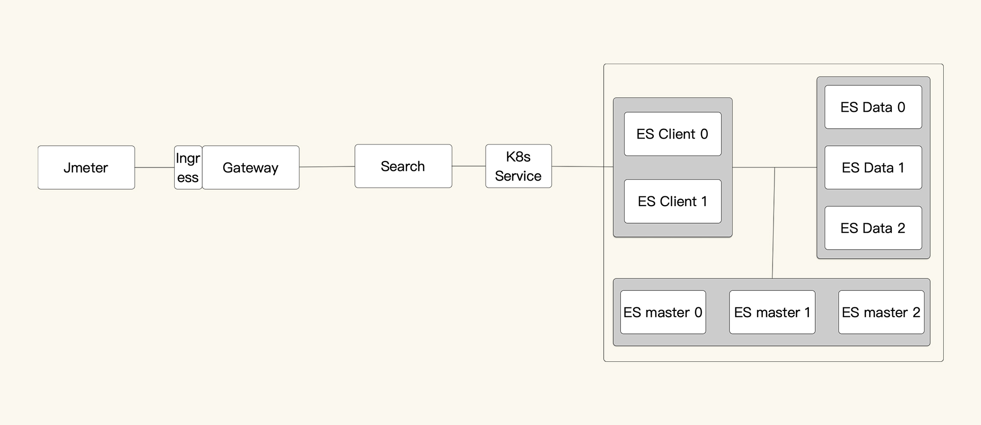 你看,从压力机到Gateway服务、到Search服务、再到ES-Client,这个APM工具也只能帮我们到这里了。因为我们用的是ElasticSearch 7来做的搜索服务的支撑,而这个skywalking工具也没有对应的Agent,所以后面并没有配置skywalking。