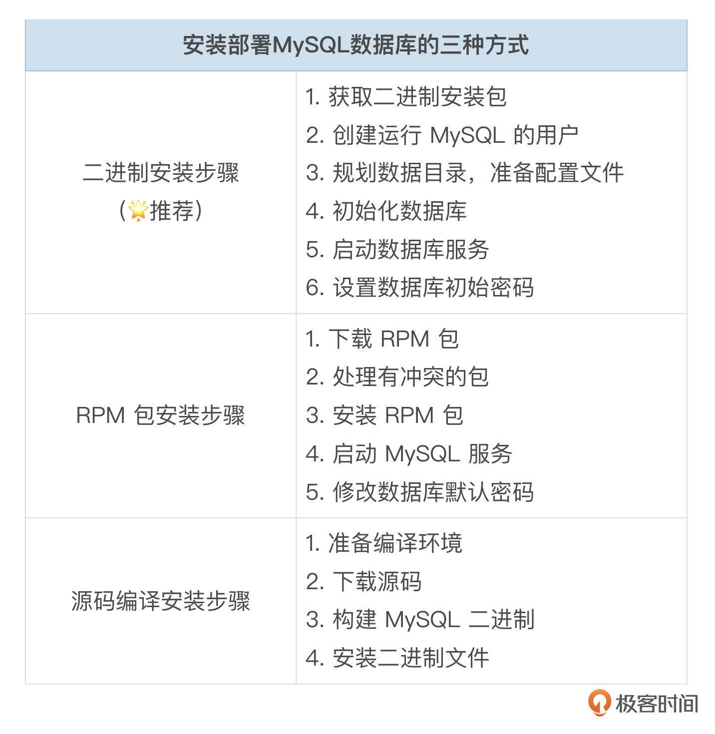 这一讲我们学习了在Linux操作系统下安装MySQL的几种方法。如果你需要安装部署大量MySQL服务器,我个人比较推荐使用二进制的方式安装。你需要制定一个标准规范,包括二进制安装路径、数据文件存放路径、服务器和数据库的标准参数配置等,并且按这个标准来部署所有的MySQL环境。