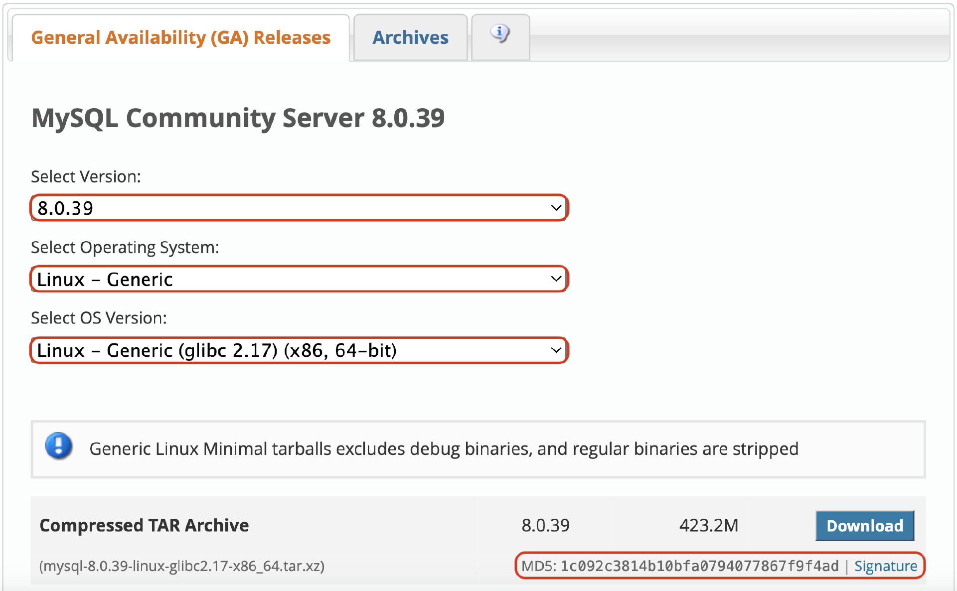 先到MySQL官网下载二进制安装包,选择8.0 GA最新版本,当前8.0最新GA版本是8.0.39。