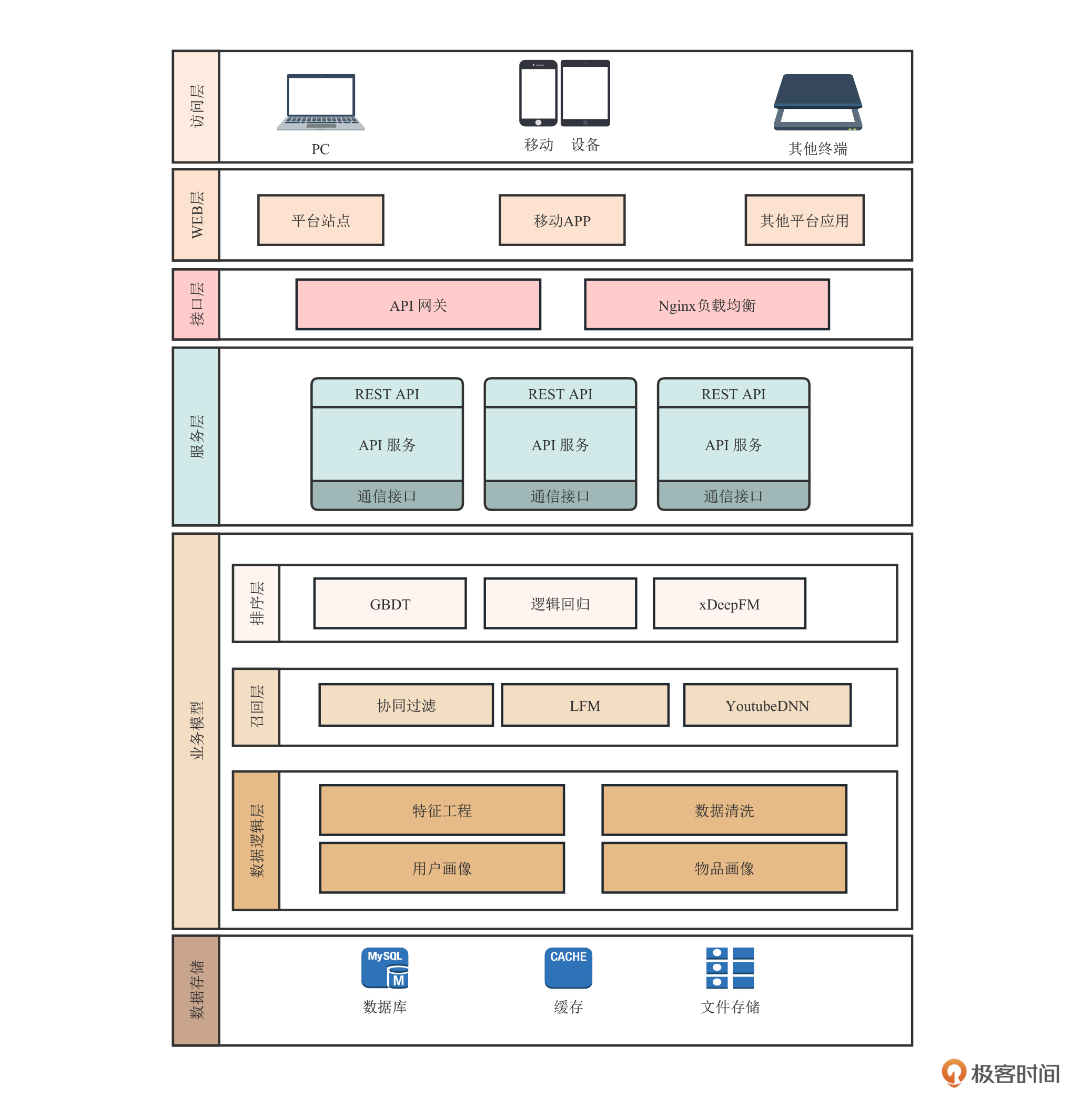 在这里,访问层指的是用户访问我们的App或者网站时所使用的设备,它可以是手机、电脑或者iPad等,当用户打开我们的App(或者网站)时,就可以浏览到推荐系统给用户推荐的内容。