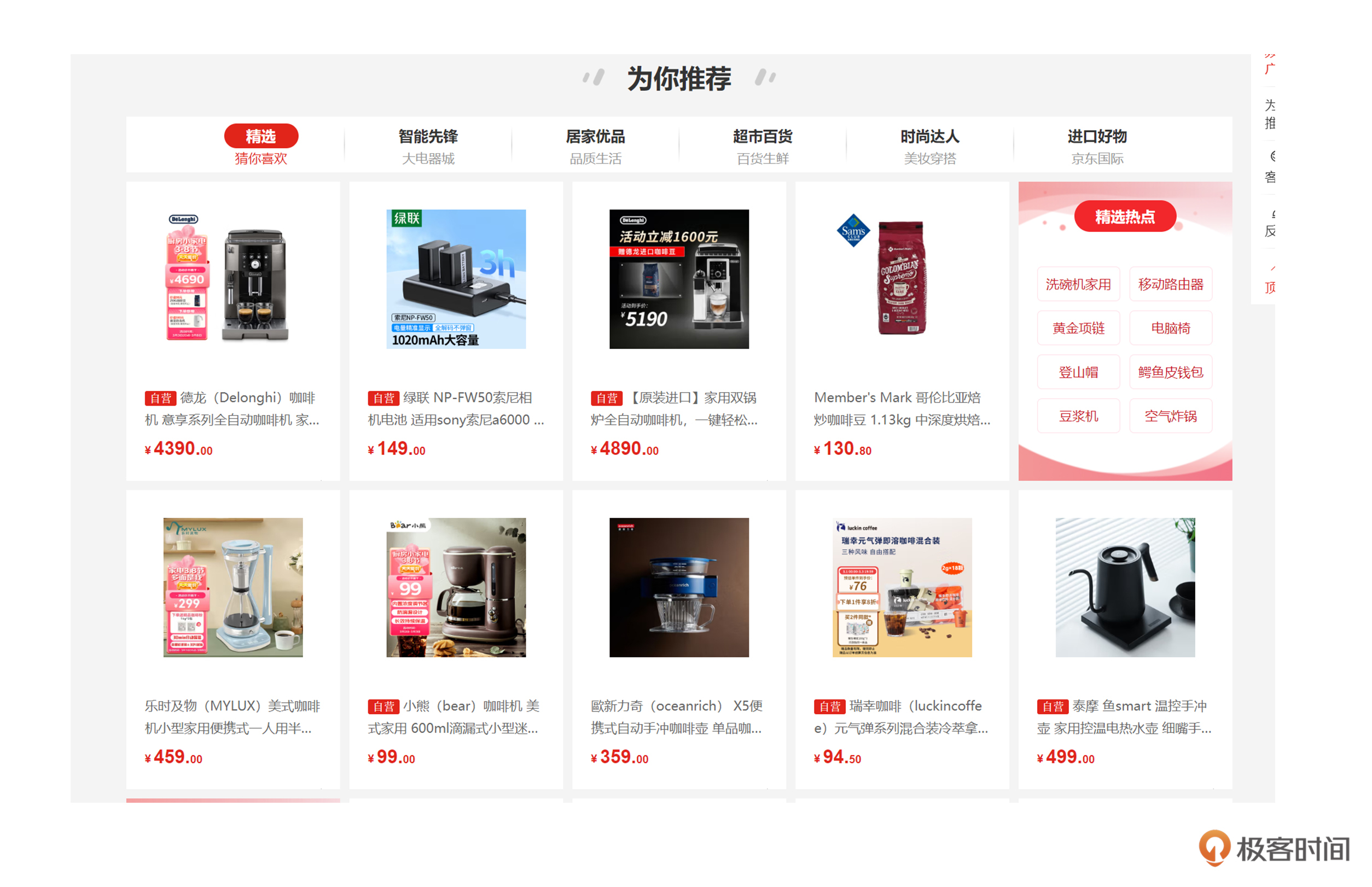现在,人们在家里就可以足不出户地网购了。**网购面对的是一个个的电商网站,电商网站中的推荐系统(Recommend System)其实就充当了上面场景中服务员的角色。**下面这张图显示的是在我电脑中打开的一个电商系统的网页。可以看到,由于我经常在这个网站上购买咖啡及咖啡相关产品,因此它会给我推荐咖啡机和咖啡豆等产品。