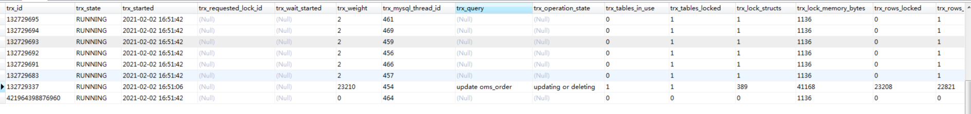 在分析内存时,我们可以过滤掉java自己的对象,只看和业务相关的对象。从上面的第3、4条可以看出,com.mysql.cj.protocol和SQL相关,那我们就到innodb_trx表中去查一下,看看有没有执行时间比较长的SQL。