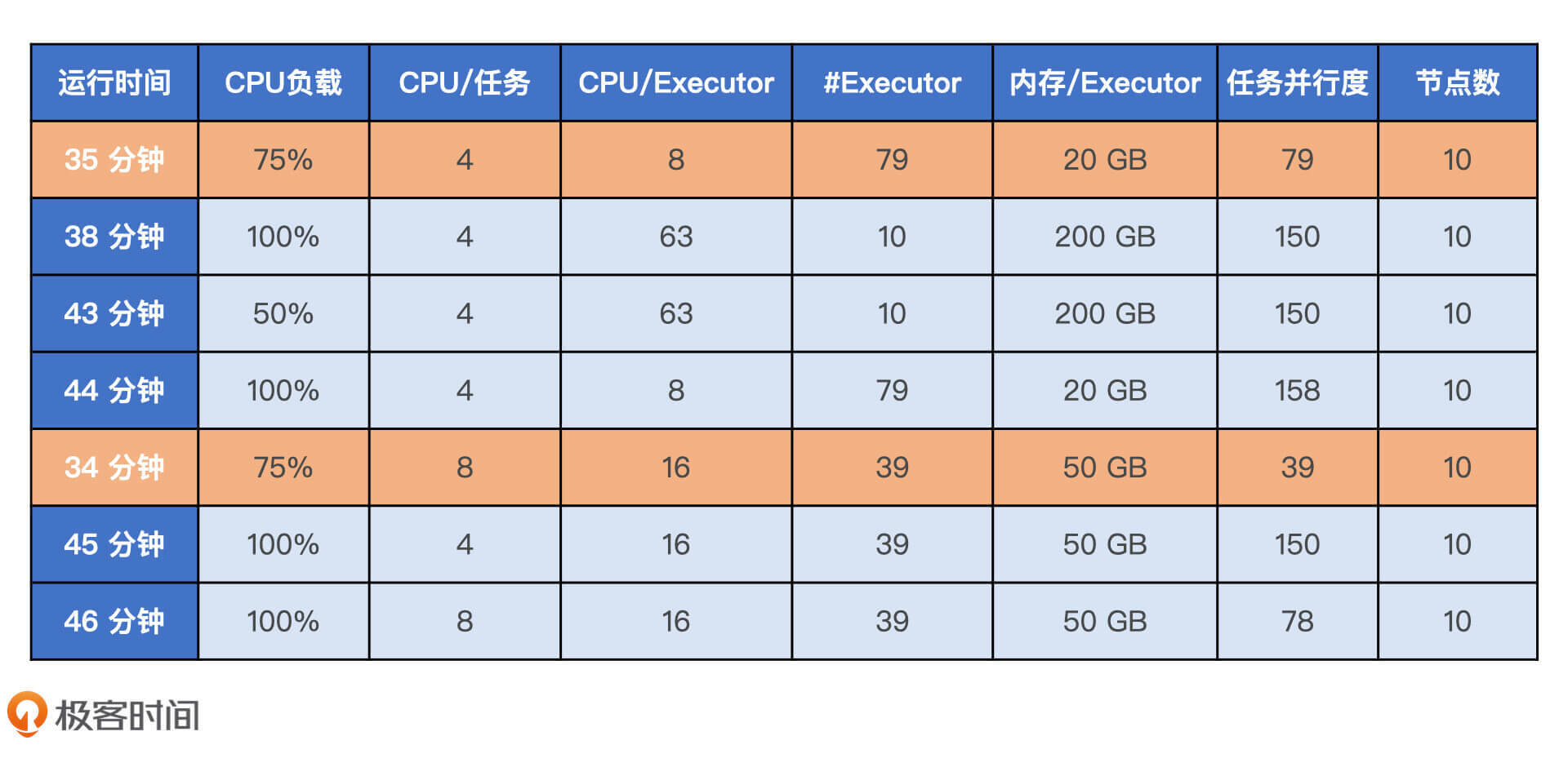 对于应用代码和Spark配置项层面的调优方法与技巧,以及这些技巧在典型场景和硬件资源利用率调控中的综合运用,我会在《性能篇》逐一展开讲解,从不同层面、不同场景、不同视角出发,归纳出一套调优的方法与心得,力图让你能够按图索骥、有章可循地去开展性能调优。