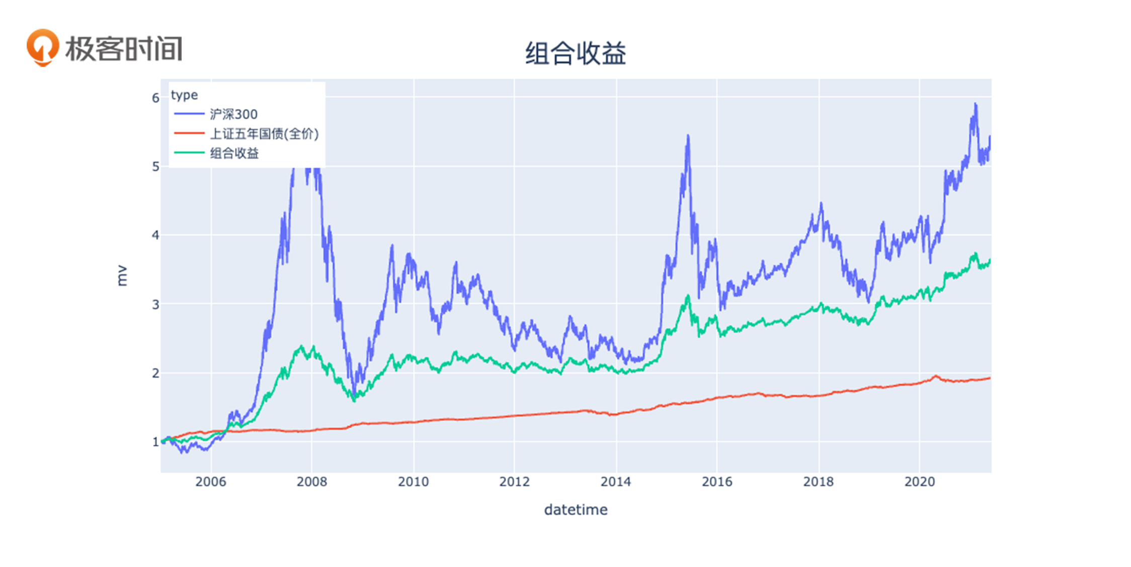 代表股票资产的沪深300指数,长期波动率大致是20%;代表债券资产的上证5年国债指数,波动率大致是2%。它们波动率的倒数比值大致是1:10,这样就得出了我们构建组合的权重。