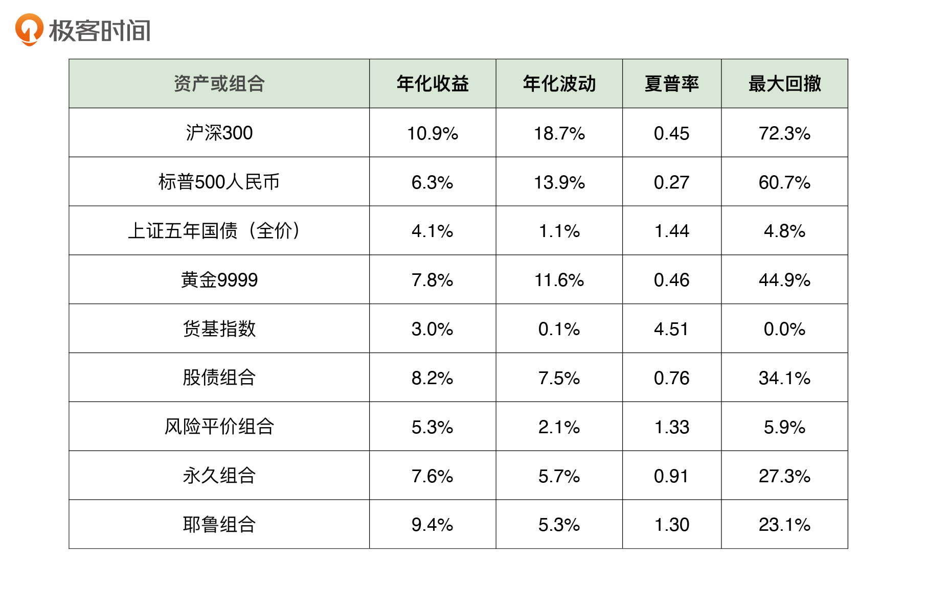 如果把这个组合跟单一资产相比,它的优势会更加明显。例如,和代表股票的沪深300相比:耶鲁组合用了不到三成的最大回撤(23% vs 72%),换来了约九成的收益(9.4% vs 10.9%),大幅度提升了投资的性价比。你看,是不是可以说得上“物美价廉”了?