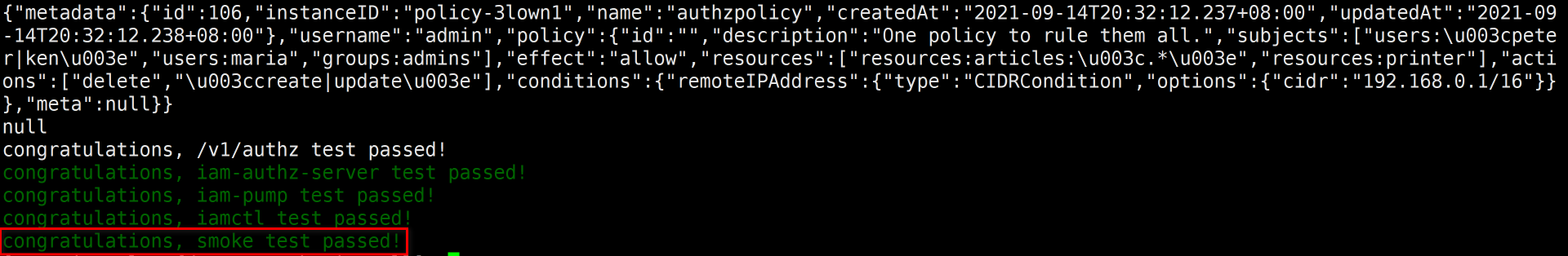 如果./test.sh iam::test::smoke命令打印的输出中,最后一行为congratulations, smoke test passed!字符串,就说明IAM应用安装成功。如下图所示: