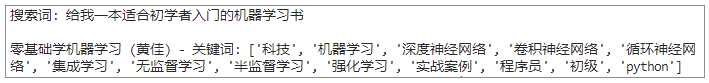 为了测试推荐系统,我们输入一个查询文本“给我一本适合初学者入门的机器学习书”,然后调用search_from_input_text函数搜索最相似的图书。