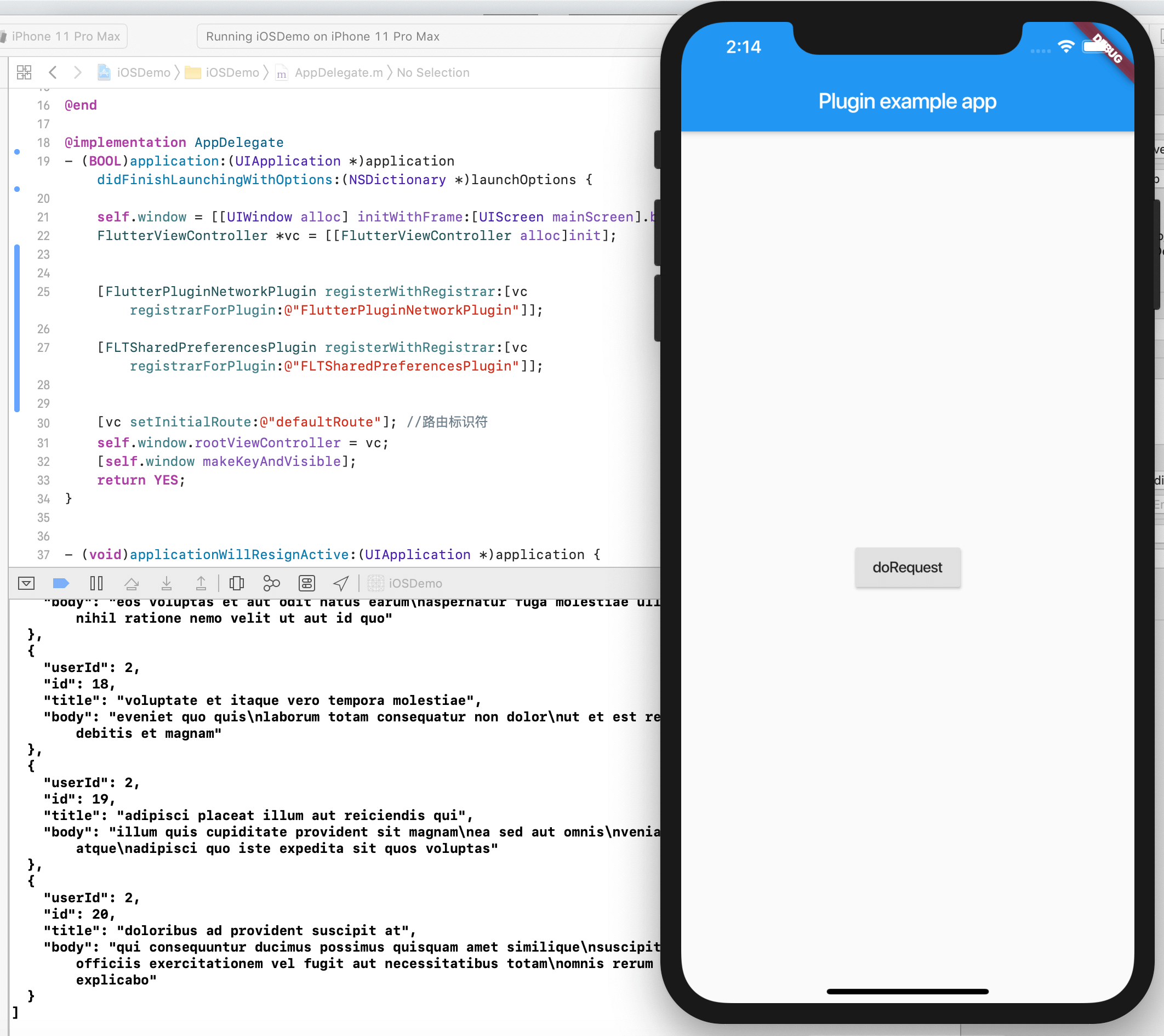 在Xcode中运行这段代码,点击doRequest按钮,可以看到,接口返回的数据信息能够被正常打印,证明我们已经可以在原生iOS工程中顺利的使用Flutter模块了。