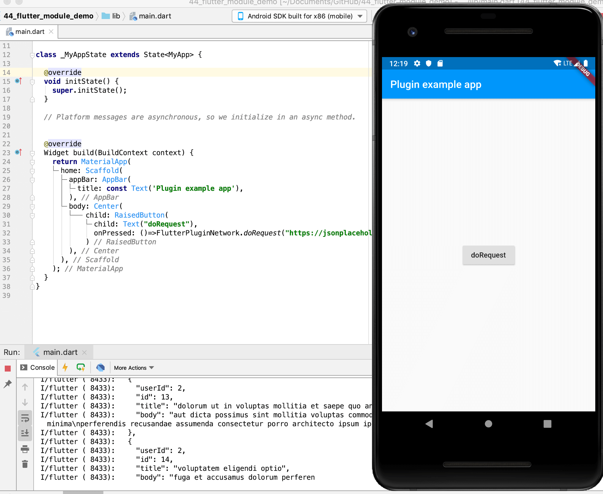 在Android Studio中运行这段代码,并点击doRequest按钮,可以看到,我们可以在原生Android工程中正常使用Flutter封装的页面组件了。