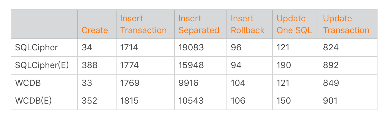 SQLite的加解密都是以页为单位,默认会使用AES算法加密,加/解密的耗时跟选用的密钥长度有关。下面是WCDB Android Benchmark的数据,详细的信息请查看链接里的说明,从结论来说对Create来说影响会高达到10倍。