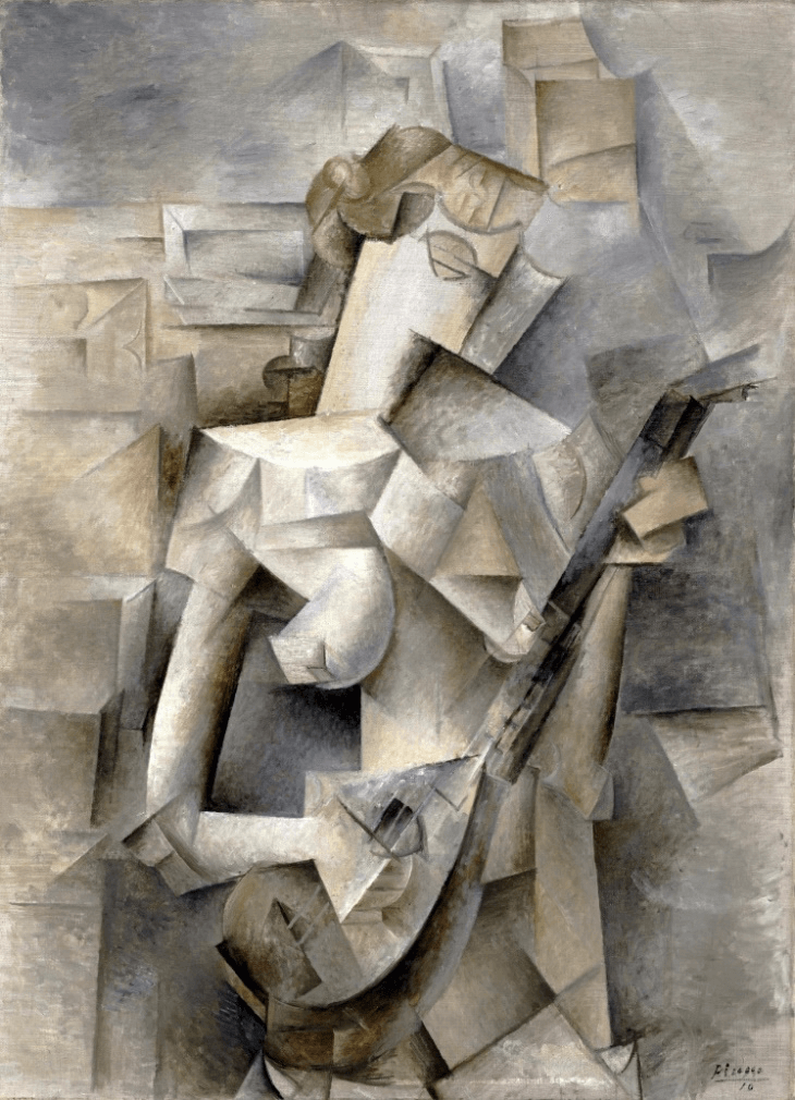 先说立体主义。我们来看看这幅毕加索的《带曼陀林的女孩》。这幅画本质上改变了我们正常的三维视觉,把更多维度在一个平面上集中呈现。
