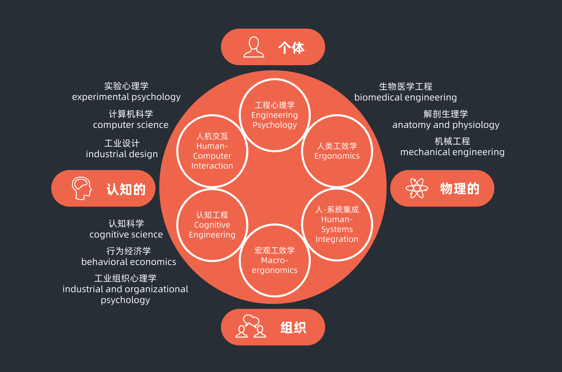 那么这个系列课,我们要讲哪些内容呢?人因学是一个庞杂的知识体系。作为一个交叉学科,它涵盖人类工效学(ergonomics),认知工程学(cognitive engineering)和人机交互(human-computer interaction)。
