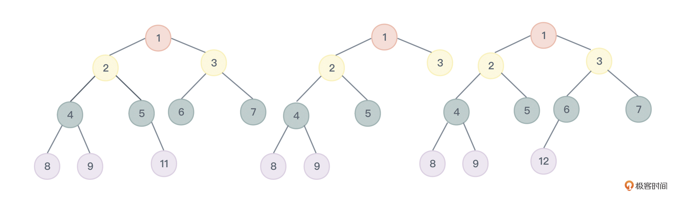 - 一棵满二叉树,依次把编号最大的1到多个节点去掉(比如去掉图5的15、14、13节点),得到的就是一棵完全二叉树。