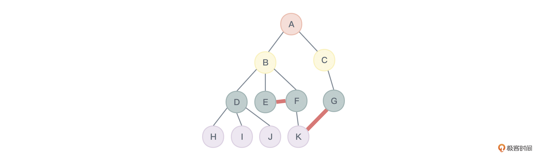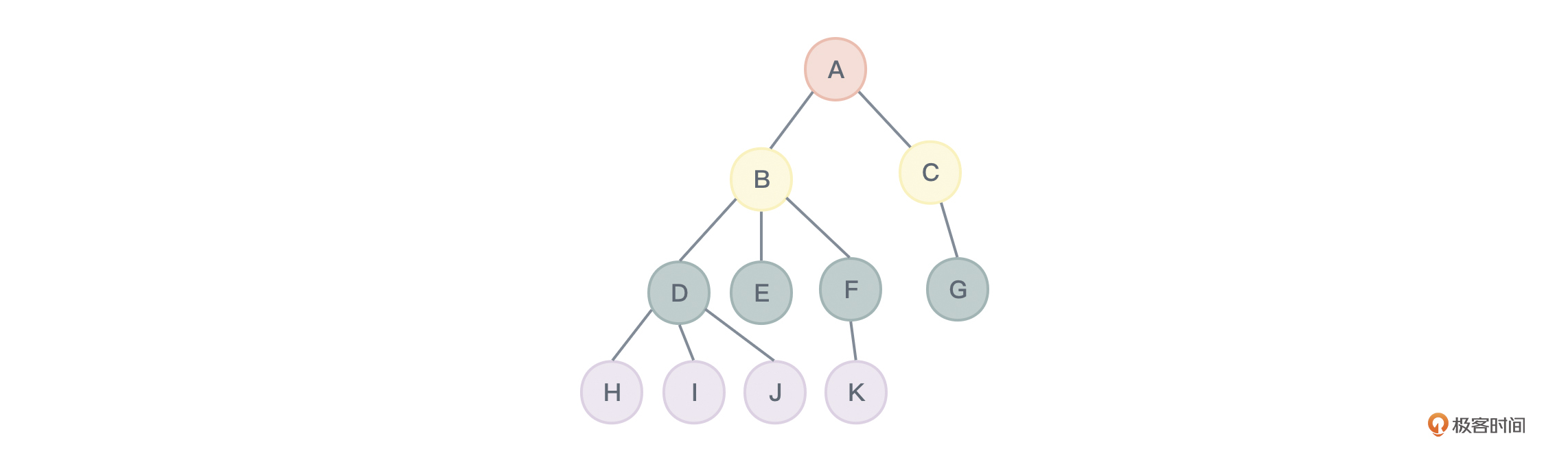 - 相同父节点的孩子之间互称兄弟节点(Sibling),比如D、E节点是兄弟节点,H、I节点也是兄弟节点。层次相同但父节点不同的孩子之间互称堂兄弟节点,比如图1中节点F与节点G,节点J与节点K。