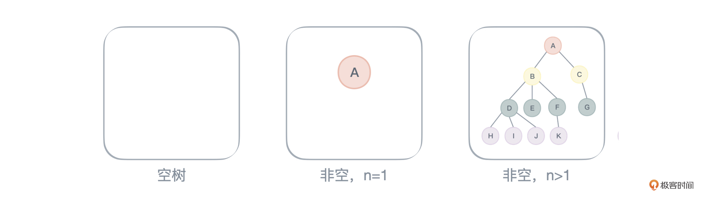在这幅图中,所有标有字母的圆圈就是树的节点。树(Tree)是n(n≥0)个节点的有限集。这里有了一个限定范围,n≥0。你可以尝试想象几种不同的情况,比如n=0,n=1,以及n>1这三种。