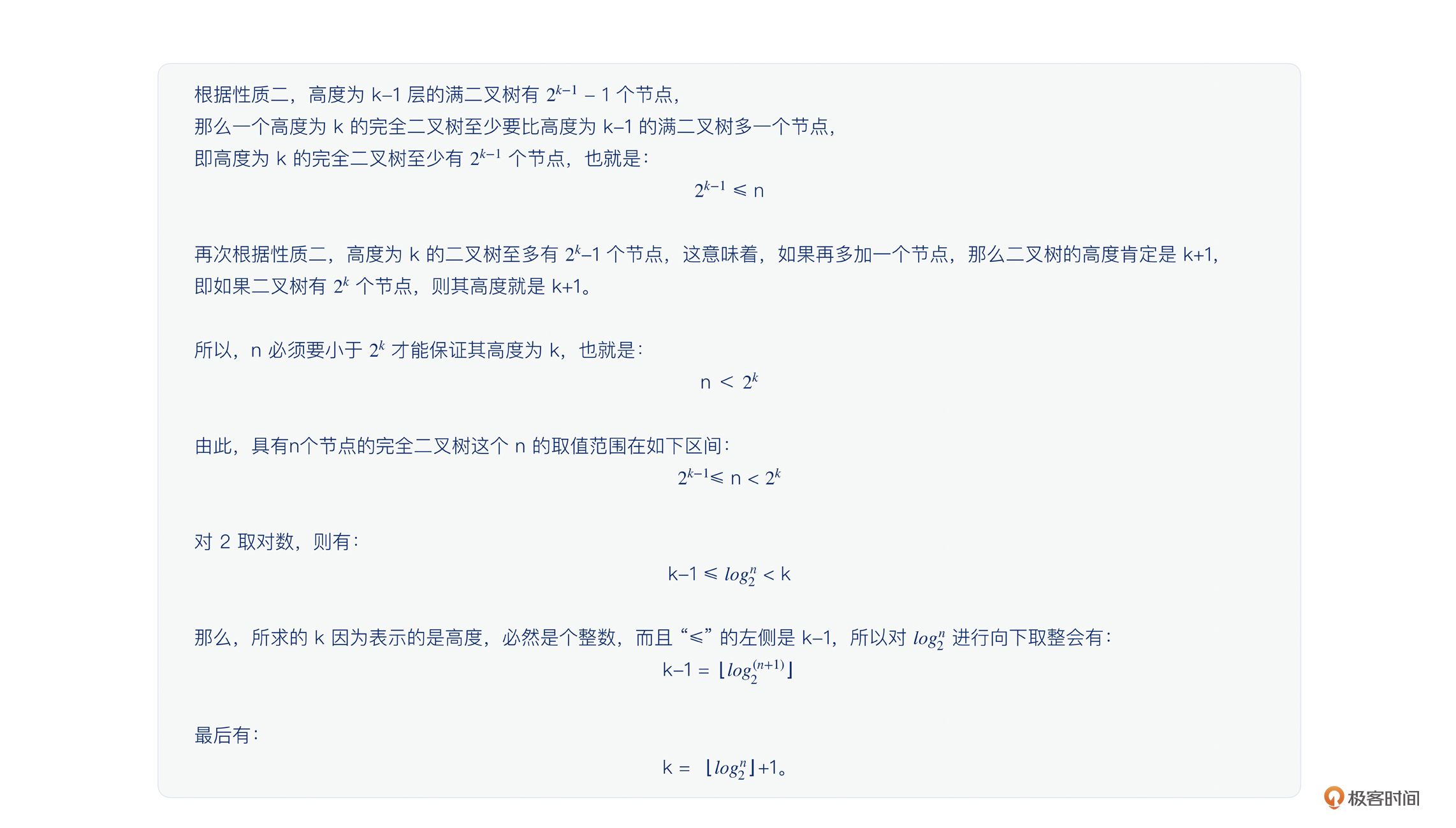 所以,不妨扩展一下性质五:一个完全二叉树的第k的节点的高度为⌈$log_{2}^{(k+1)}$⌉ 或者 ⌊$log_{2}^{k}$⌋ +1。