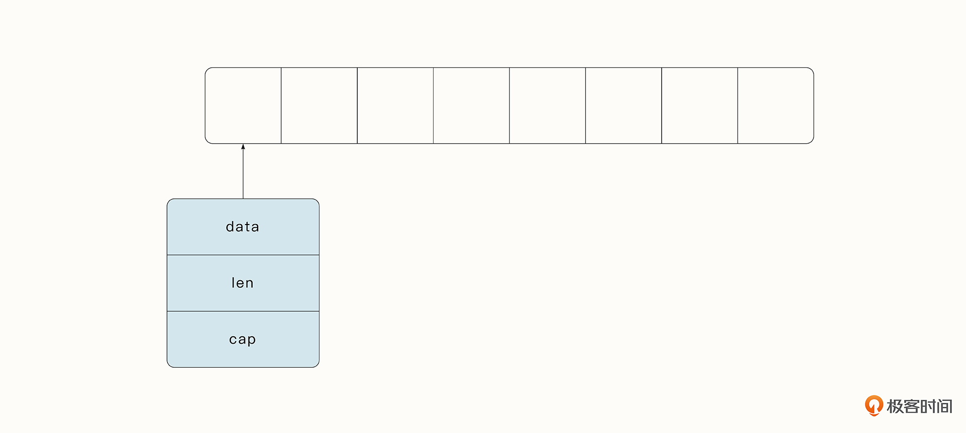 和C语言中的数组是一个指针不同,Go中的切片是一个复合结构。一个切片在运行时由指针(data)、长度(len)和容量(cap)三部分构成。