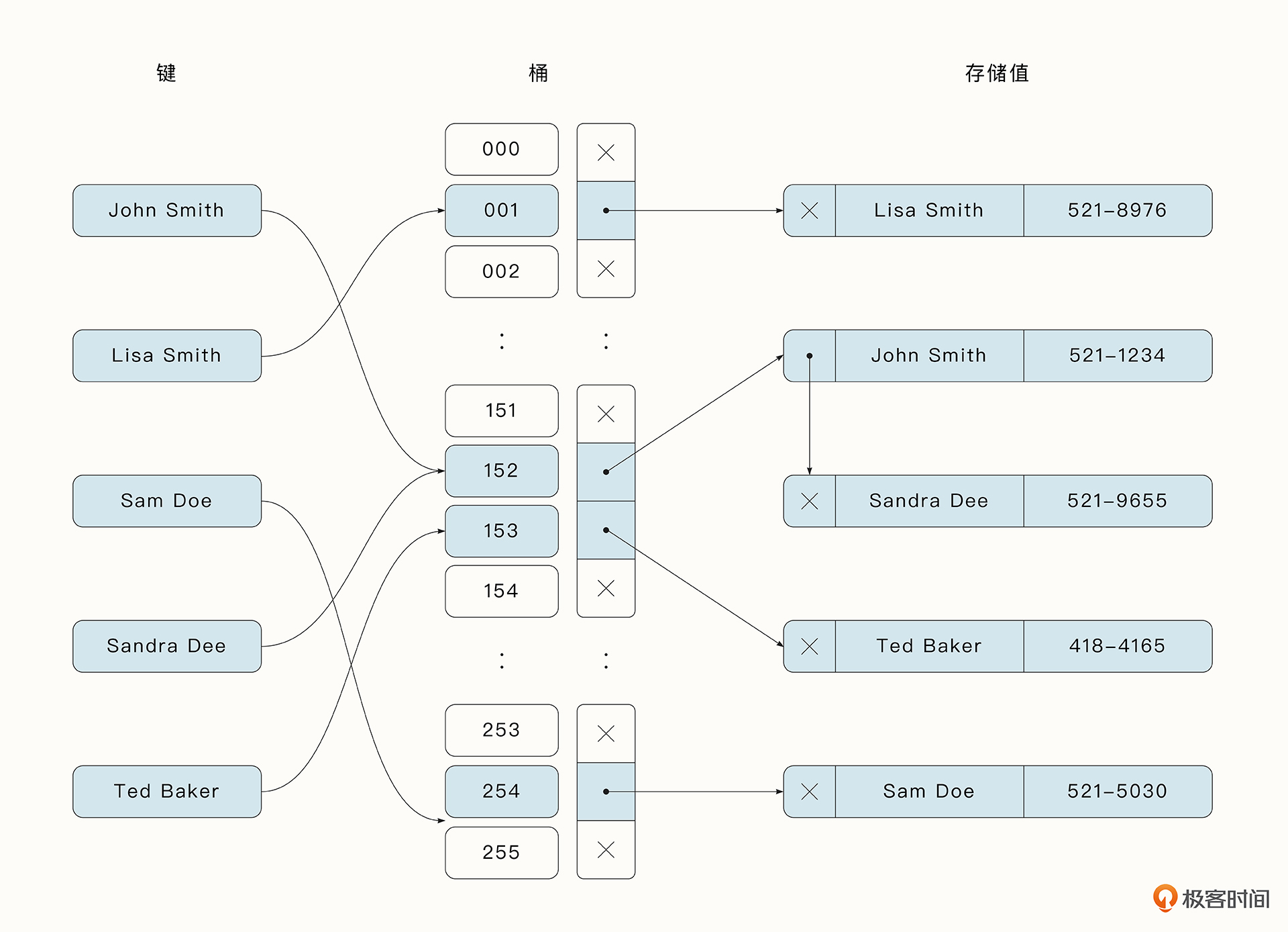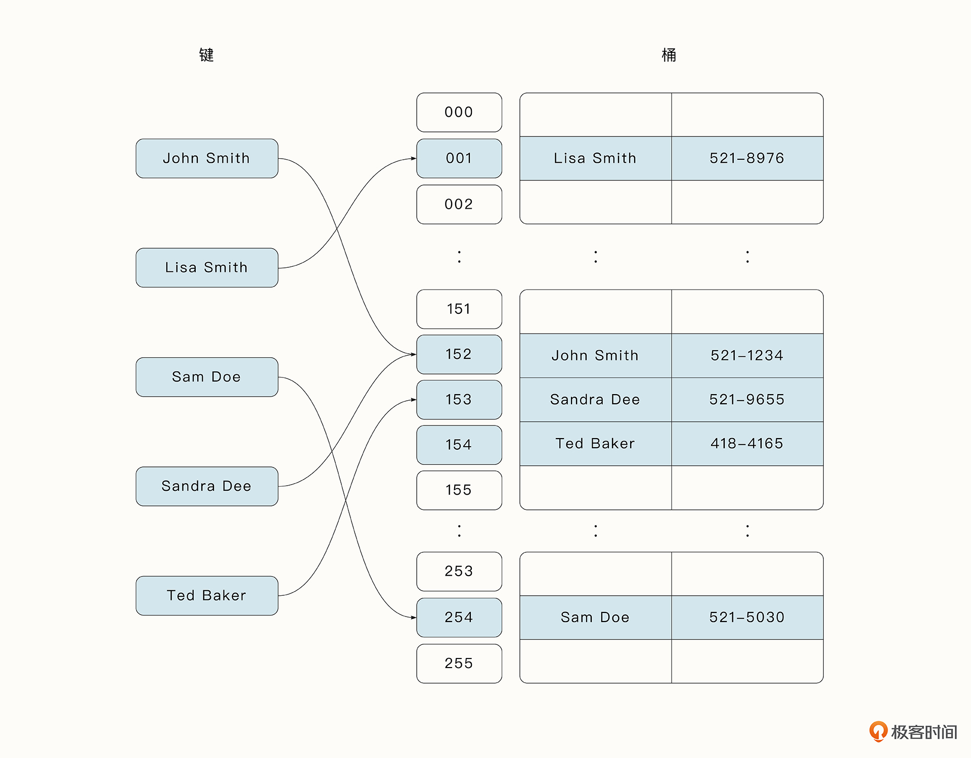 哈希表的原理是将多个键/值对(Key/Value)分散存储在Buckets(桶)中。给定一个键(Key),哈希(Hash)算法会计算出键值对存储的桶的位置。找到存储桶的位置通常包括两步,伪代码如下: