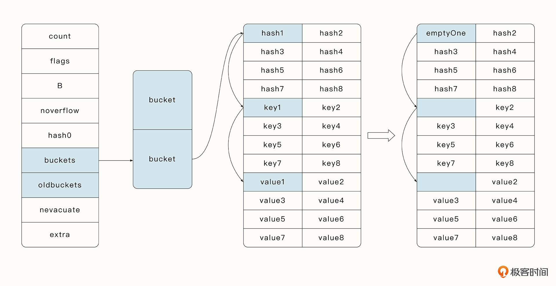 和赋值操作类似,当进行 Map 的 delete 函数时,delete 函数会根据 Key 找到指定的桶,如果存在指定的Key,那么就释放掉 Key 与 Value 引用的内存。tophash 中的指定位置会存储 emptyOne,代表当前位置是空的。