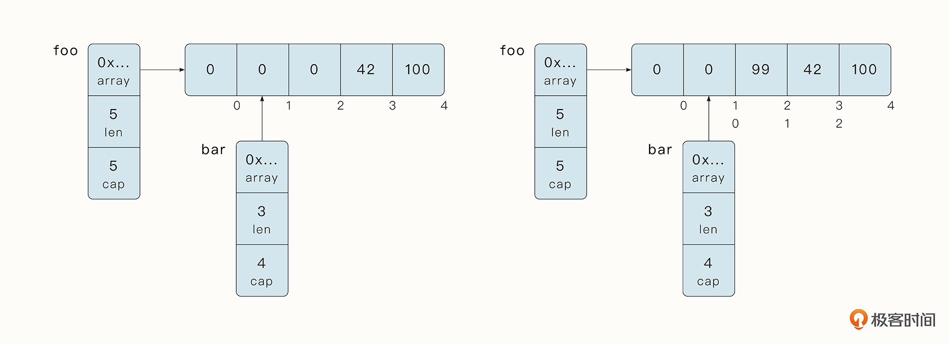 **切片在被截取时的另一个特点是,被截取后的数组仍然指向原始切片的底层数据。**例如之前提到的案例,bar 截取了foo切片中间的元素,并修改了bar中的第2号元素。