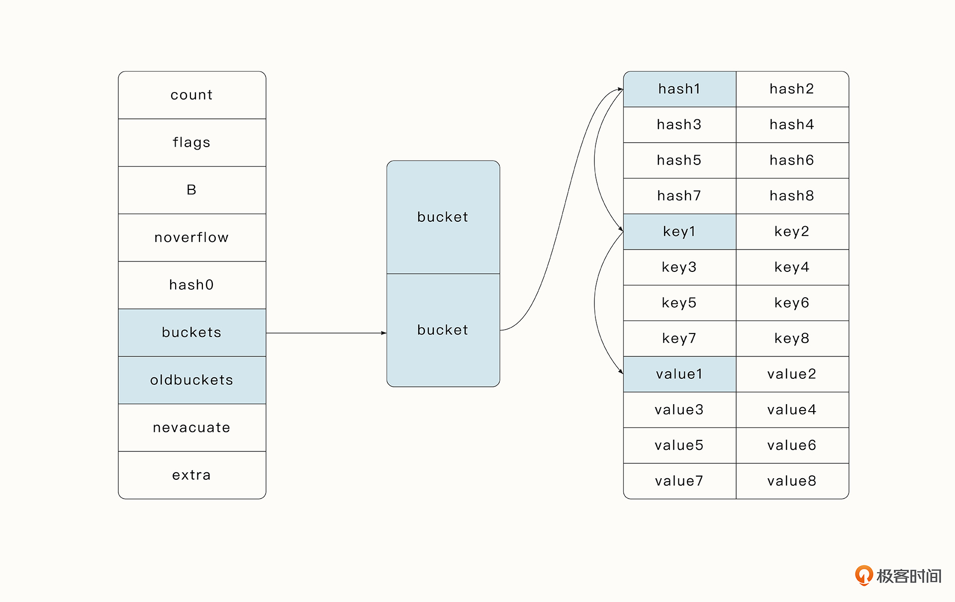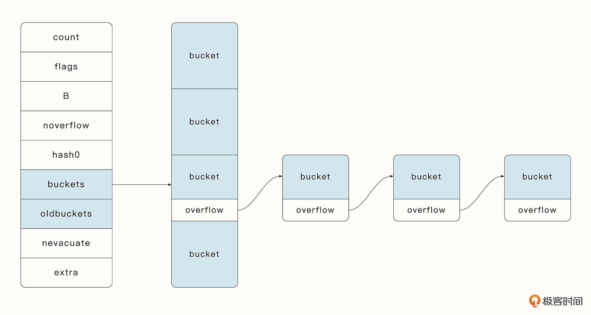 此外,在Go 语言中还有一个溢出桶的概念。在执行 hash[key] = value 的赋值操作时,当指定桶中的数据超过 8 个时,并不会直接开辟一个新桶,而是将数据放置到溢出桶中,每个桶的最后都存储了overflow,即溢出桶的指针。