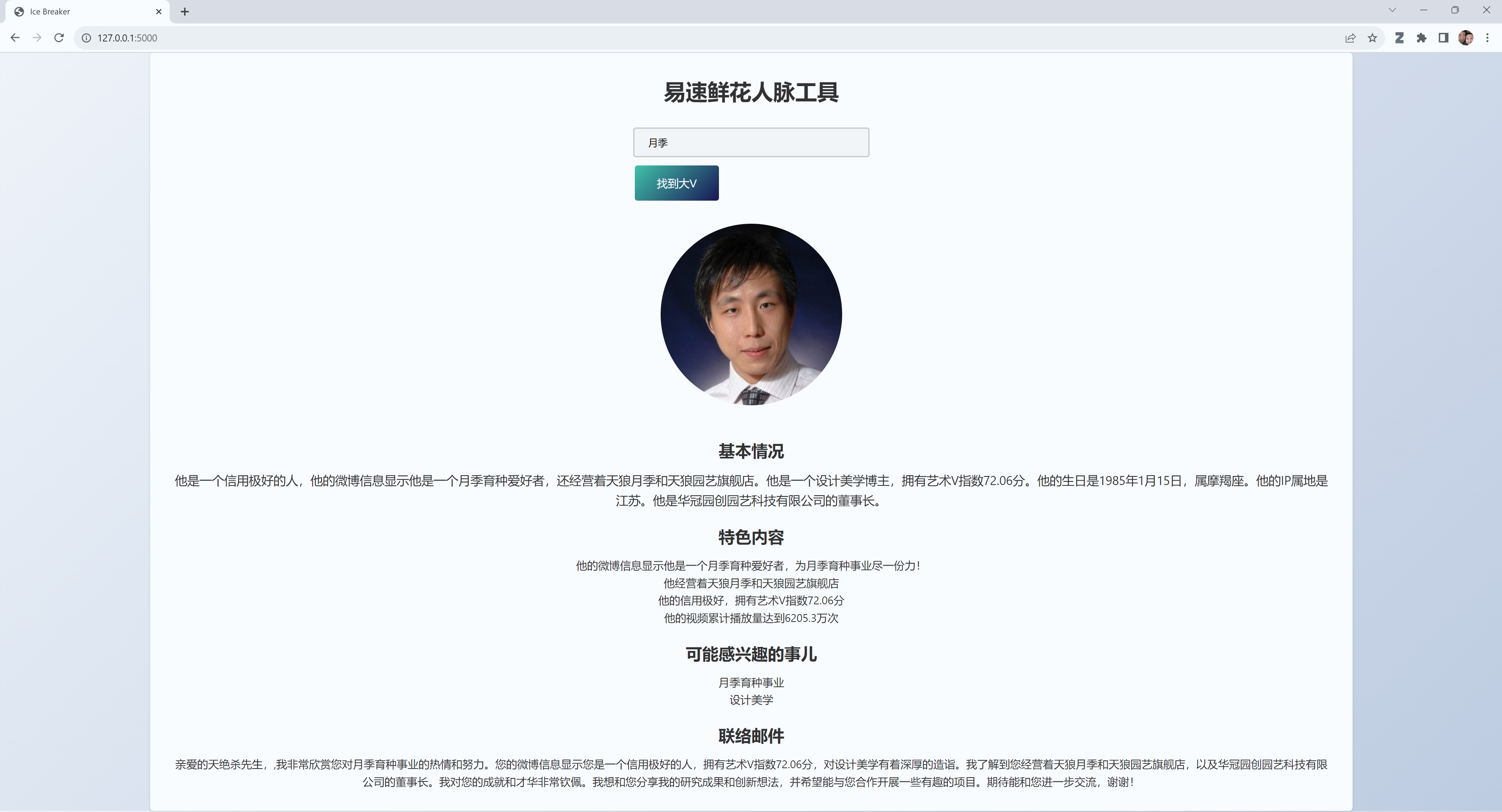 **第五步:**添加HTML、CSS,并用Flask创建一个App,在网络上部署及发布这个鲜花电商人脉工具,供市场营销部门的人员使用。