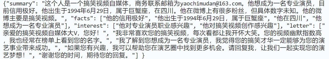 这个文案可以有很多种形式,比如说可以总结一下大V的特点,根据他的自我介绍猜测一下他的兴趣爱好,还可以让LLM帮助运营人员撰写一篇联络信件的草稿。
