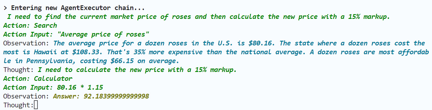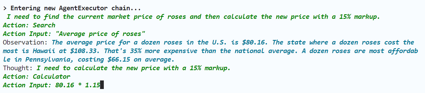 Action Input: “Average price of roses”’ (行动的输入:搜索玫瑰平均价格)
