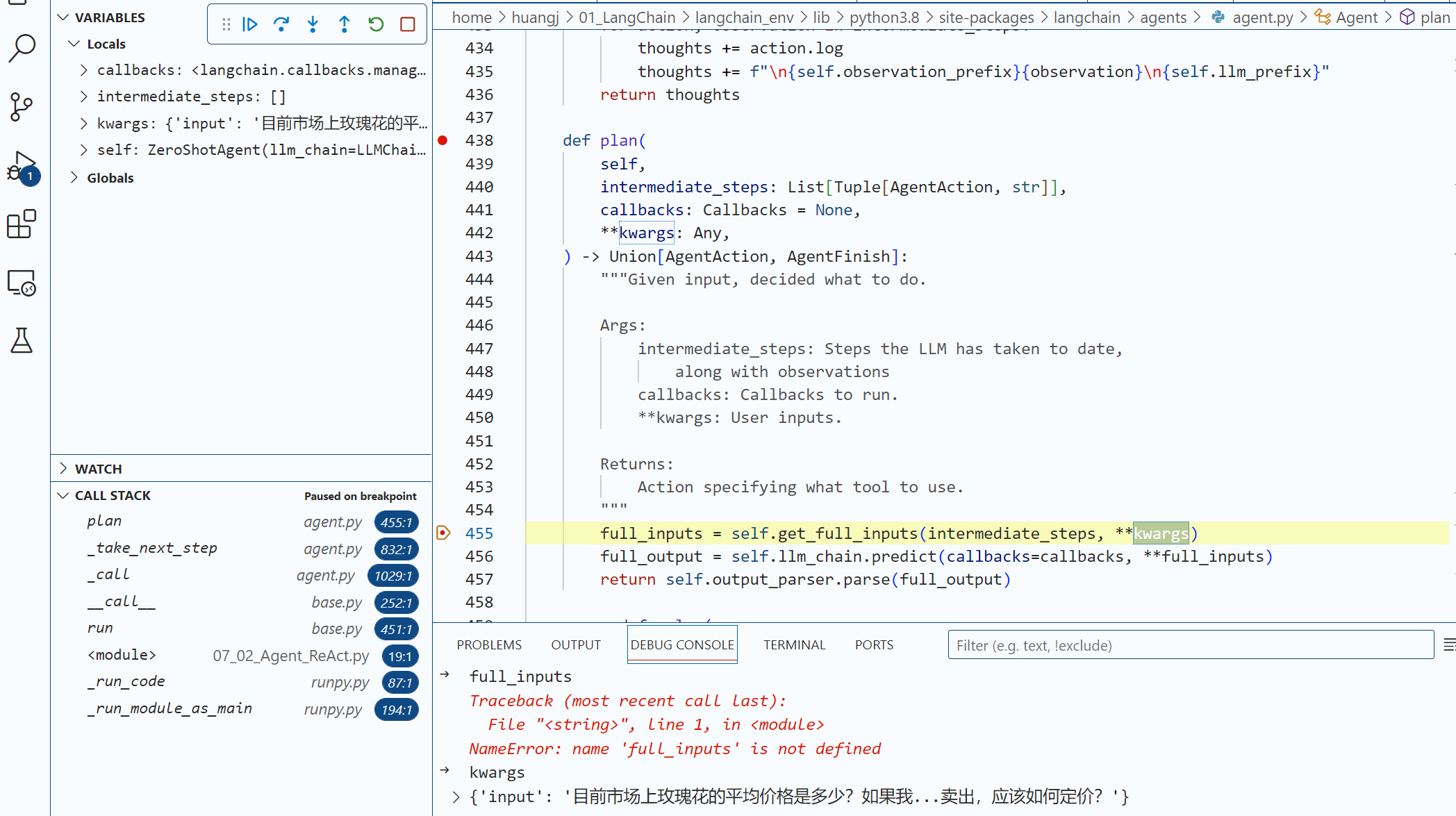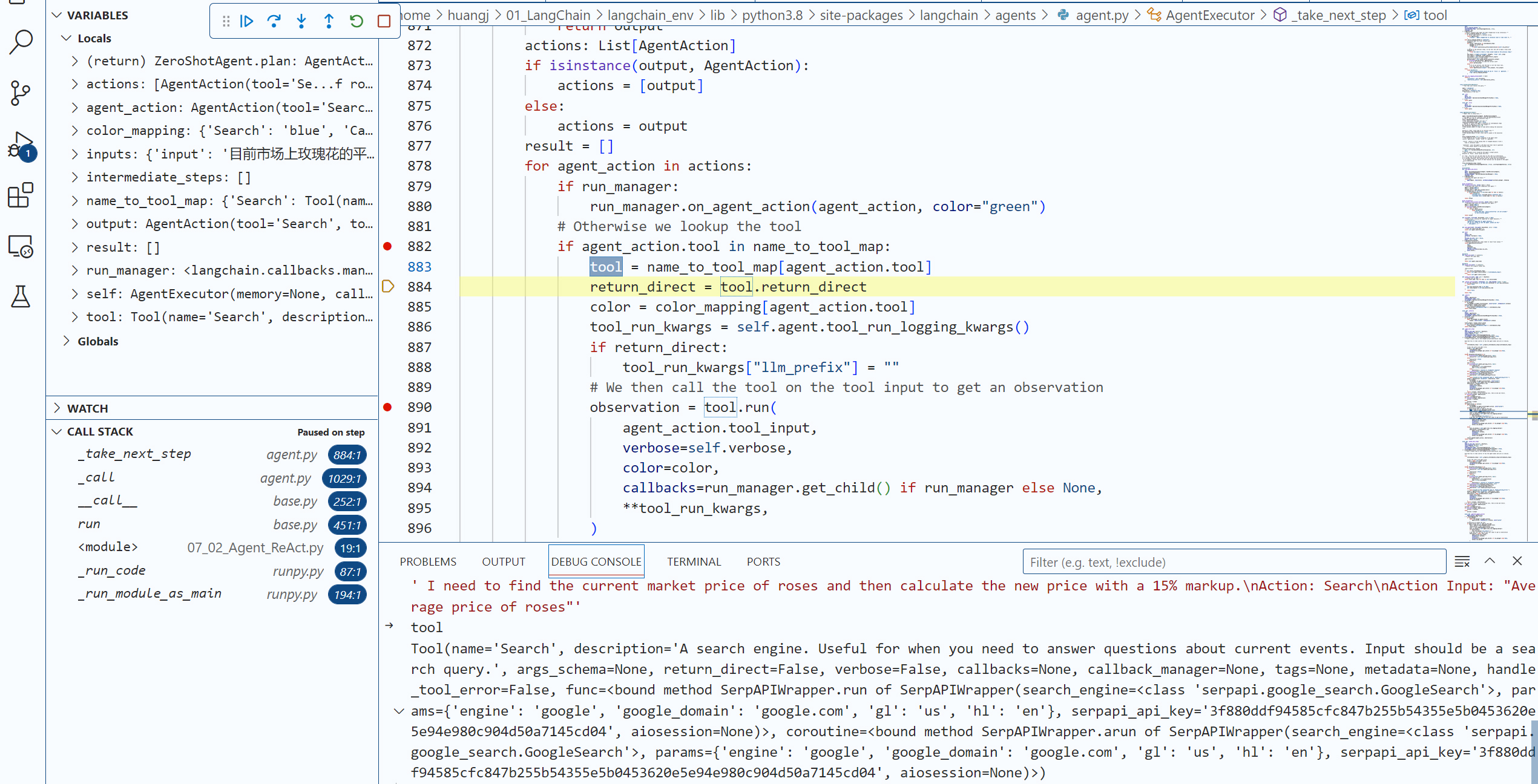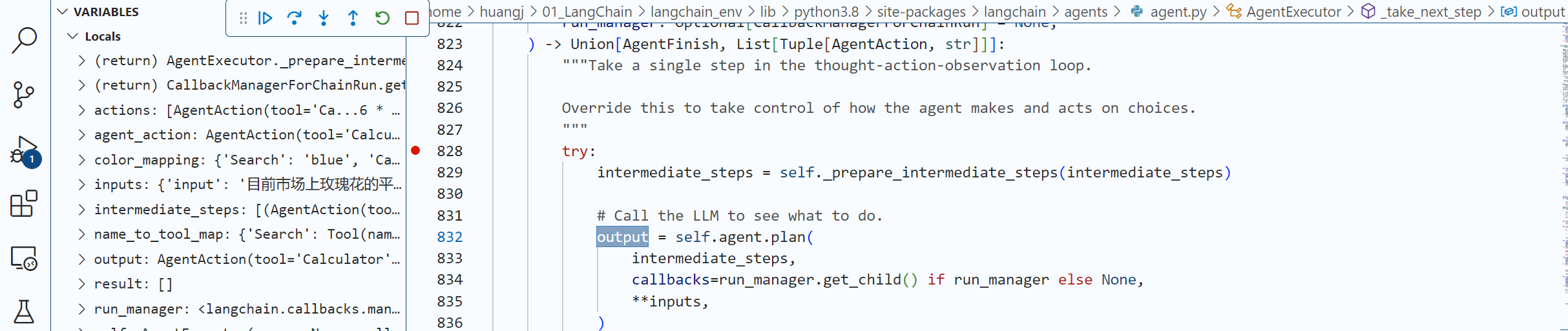现在,请你用你的代码编辑工具(比如VS Code)在agent.run这个语句设置一个断点,用 “Step Into” 功能深入几层LangChain内部代码,直到我们进入了 agent.py文件的AgentExecutor类的内部方法 _take_next_step。